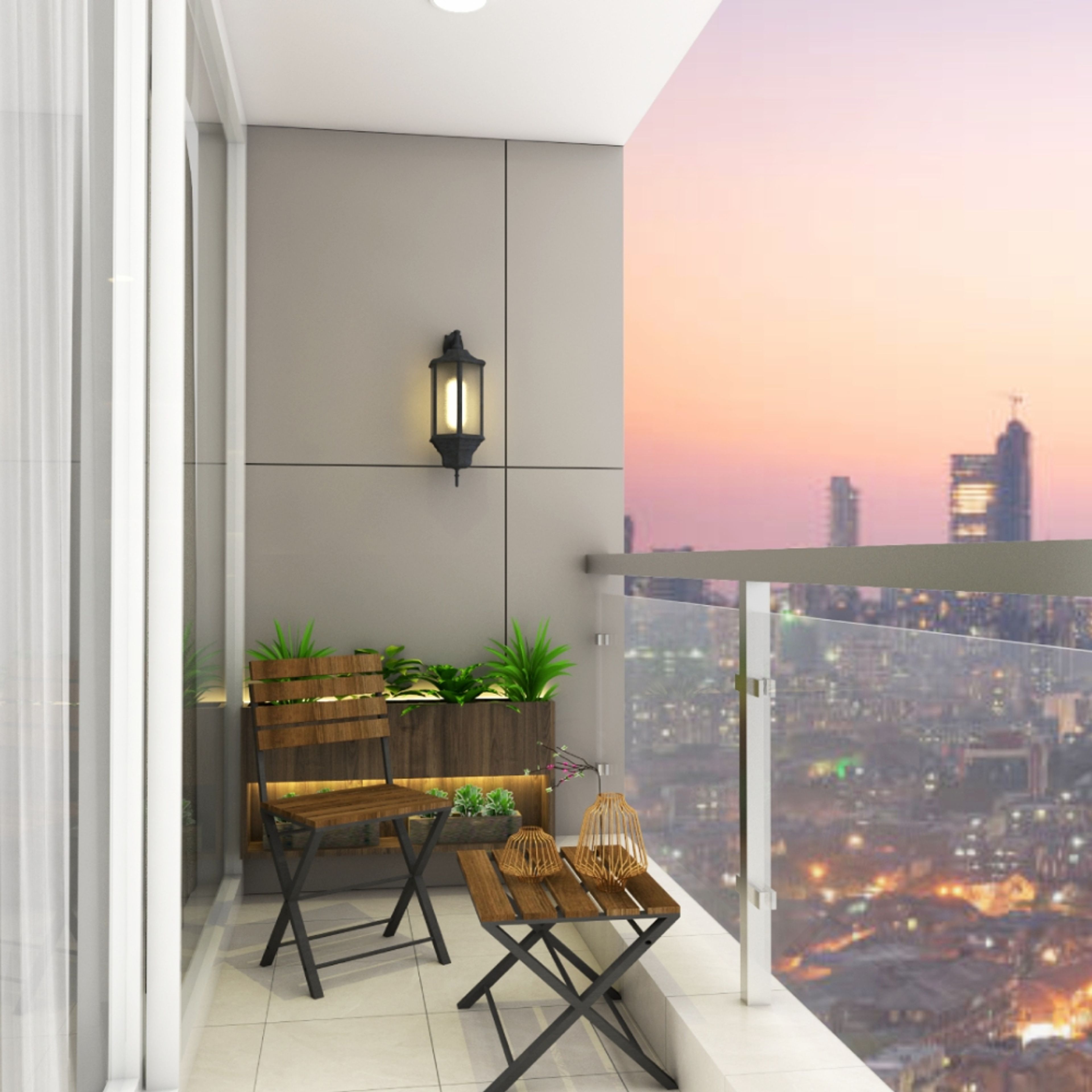 Special Features: The beige flooring complements the grey square panelled walls. The wooden furniture adds pops of colour through the space, while giving the balcony a timeless charm.