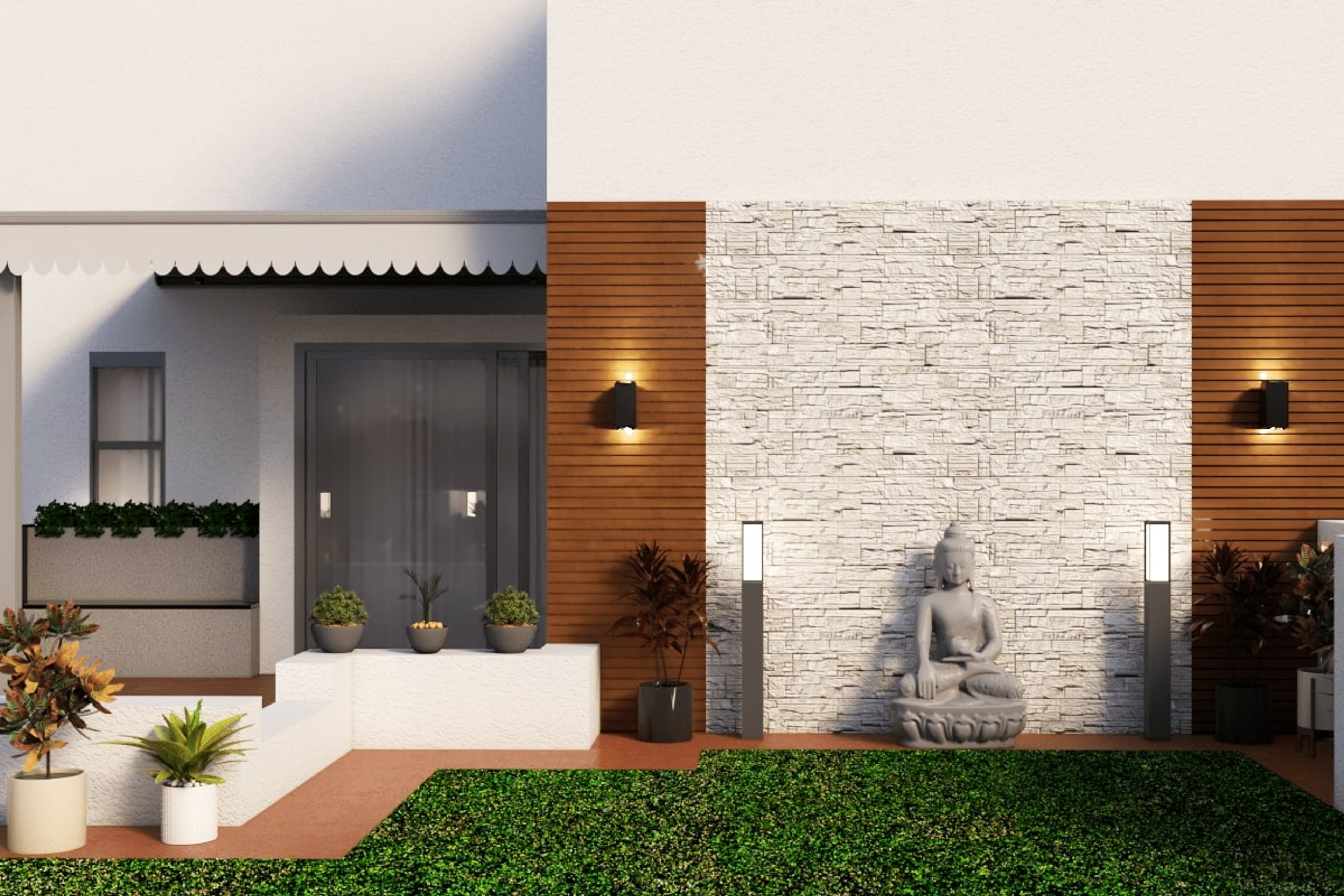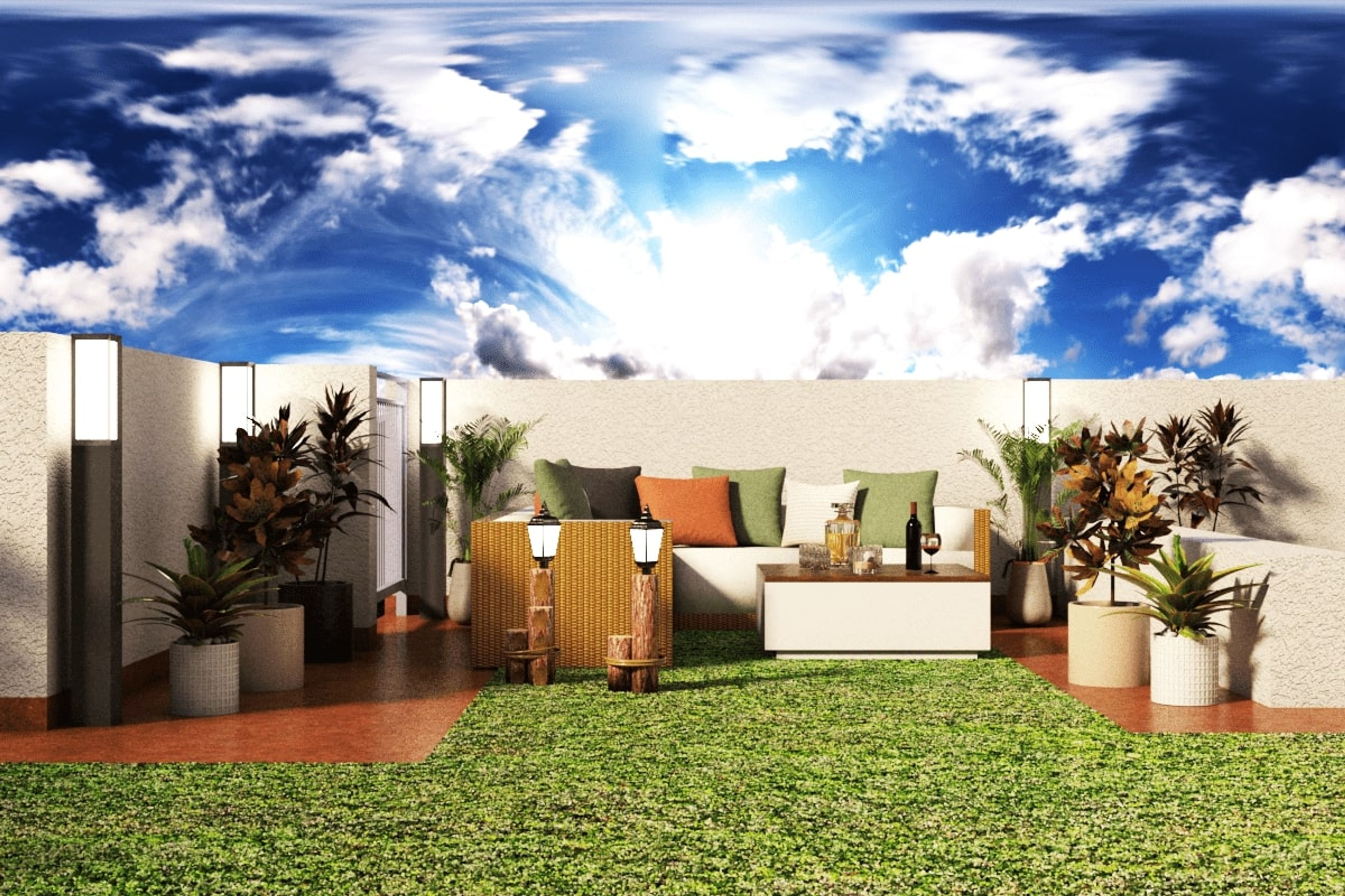 This spacious balcony is decorated in a modern way. The wooden panels with the wall lights and outdoor lights brighten up this space. The combination of wooden flooring and the grass look good. The outdoor furnitures are added to unwind with a cup of tea.