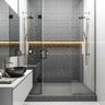 The spacious bathroom has a vanity on one side and an open shower on the other. The white subway tiles in the wainscoting offer a perfect contrast to the deep sea blue colour of the upper half of the walls. The mirror has a stunning brass frame that ties together the two halves. The lattice-print tiles add to the aesthetics of the contemporary styling of the space.