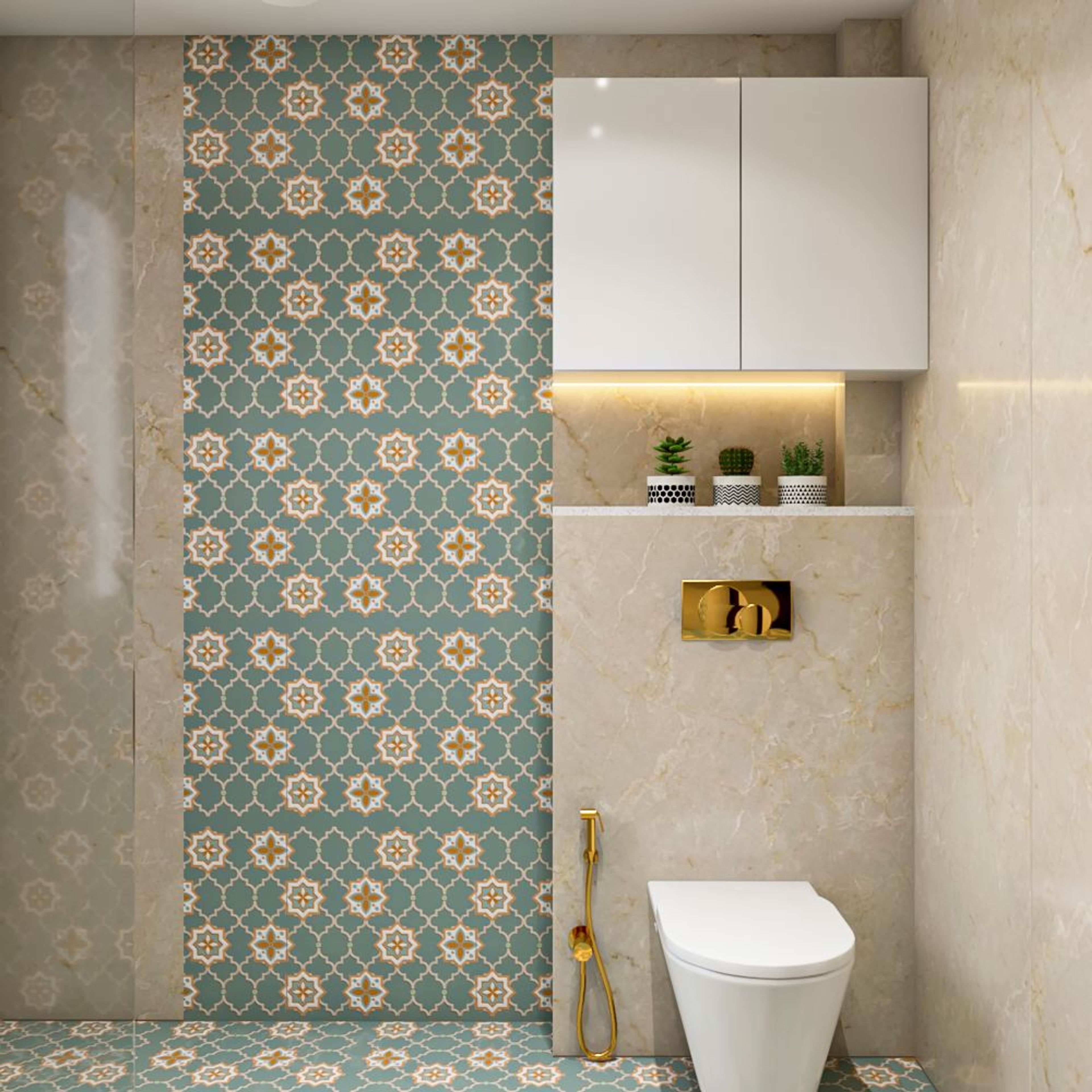 Alluring green Moroccan pattern tiles contrast beautifully in this classic bathroom design. The spacious room partitions the wet areas conveniently with a sleek glass divider. The charming and ornate mirror frame adds an opulent look to the bathroom, with brass-finished bathroom sanitary units lending a classy feel to the bathroom interiors.