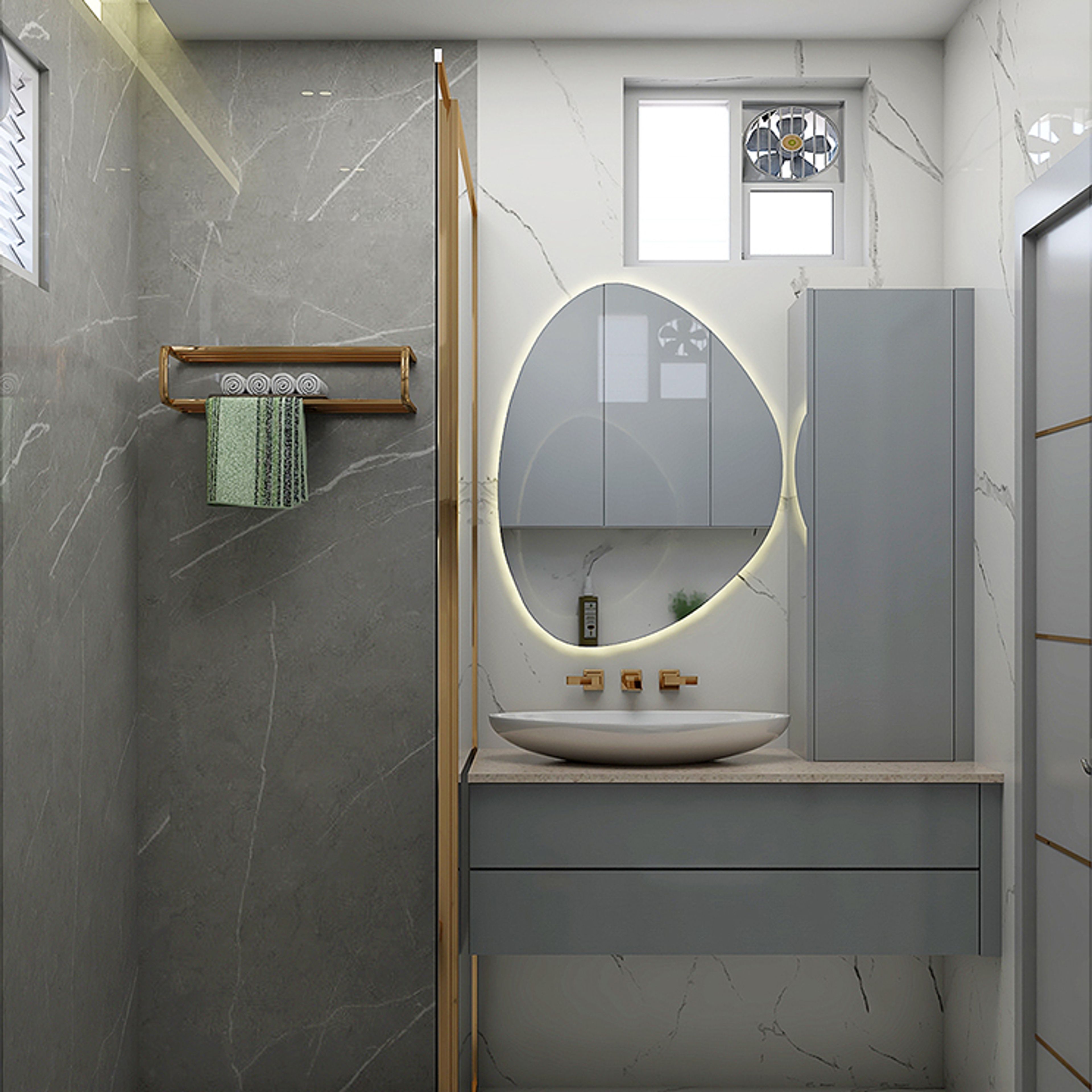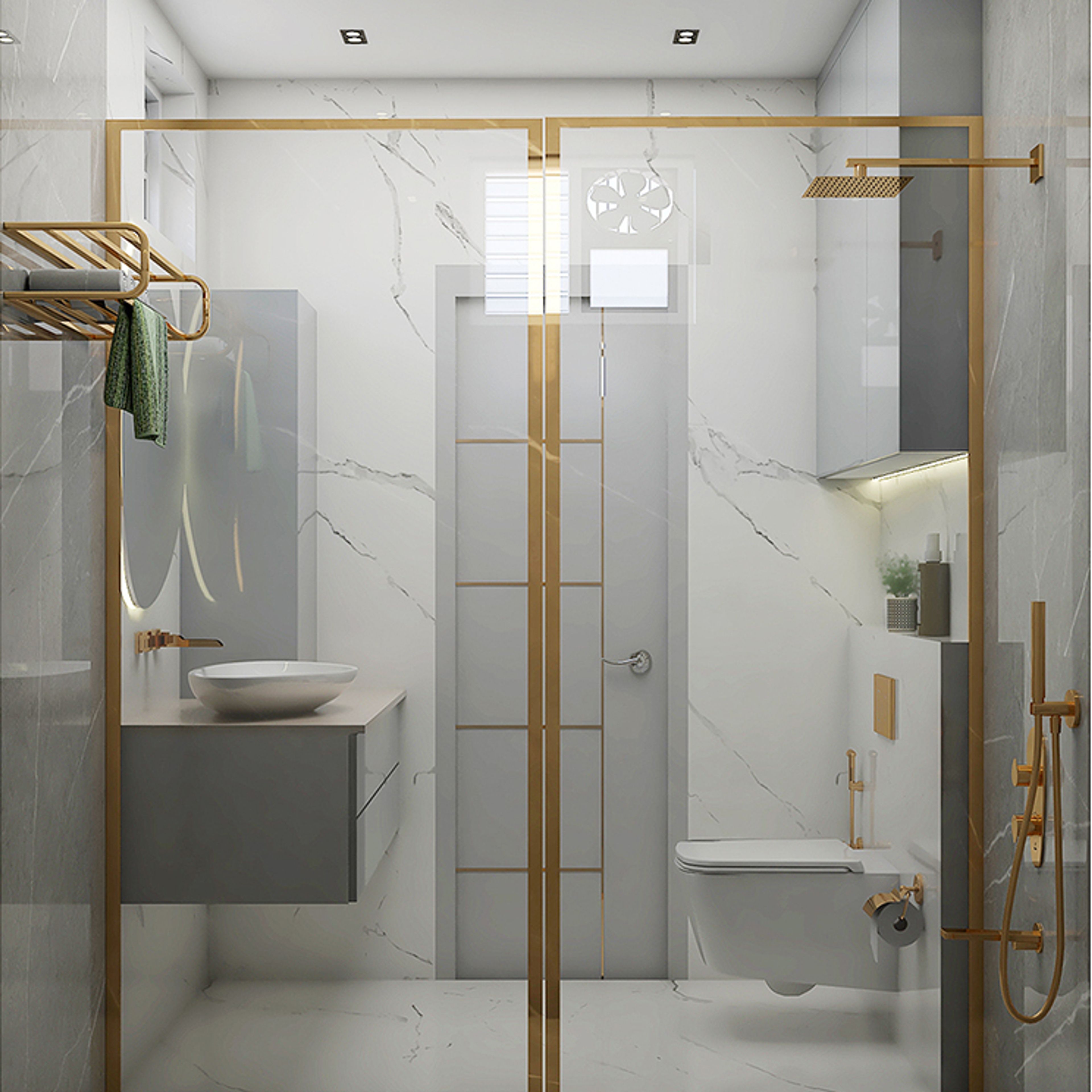 1.Spacious contemporary bathroom with golden accents on glass partition and other elements