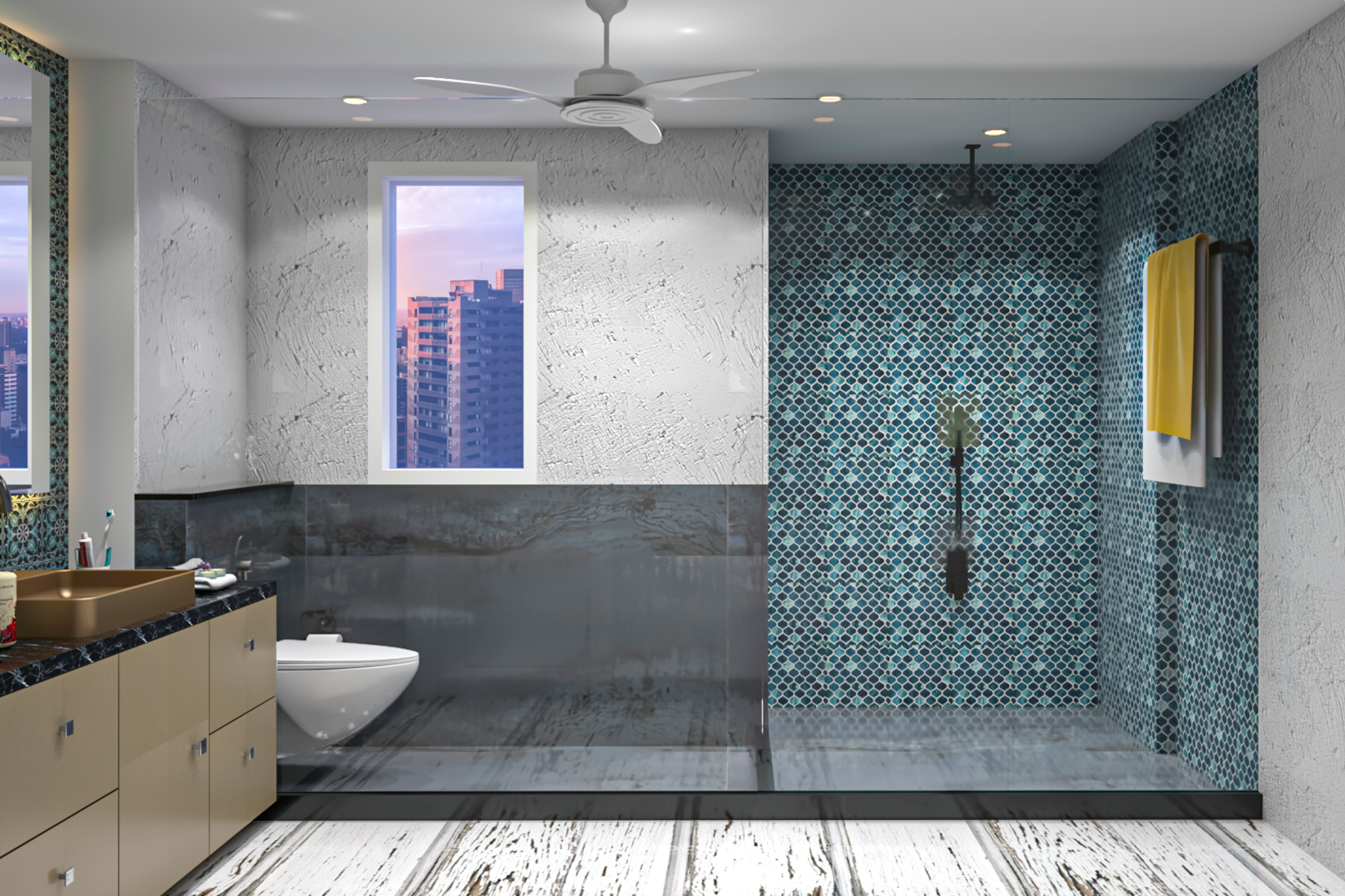 This spacious bathroom is designed with contemporary decor. The black stone counter with a beige storage cabinet and countertop basin looks good. The large wall-mounted mirror with strip light highlights the dark blue patterned wall tiles. The glass partitiosepaareasrateses the dry and wet area.