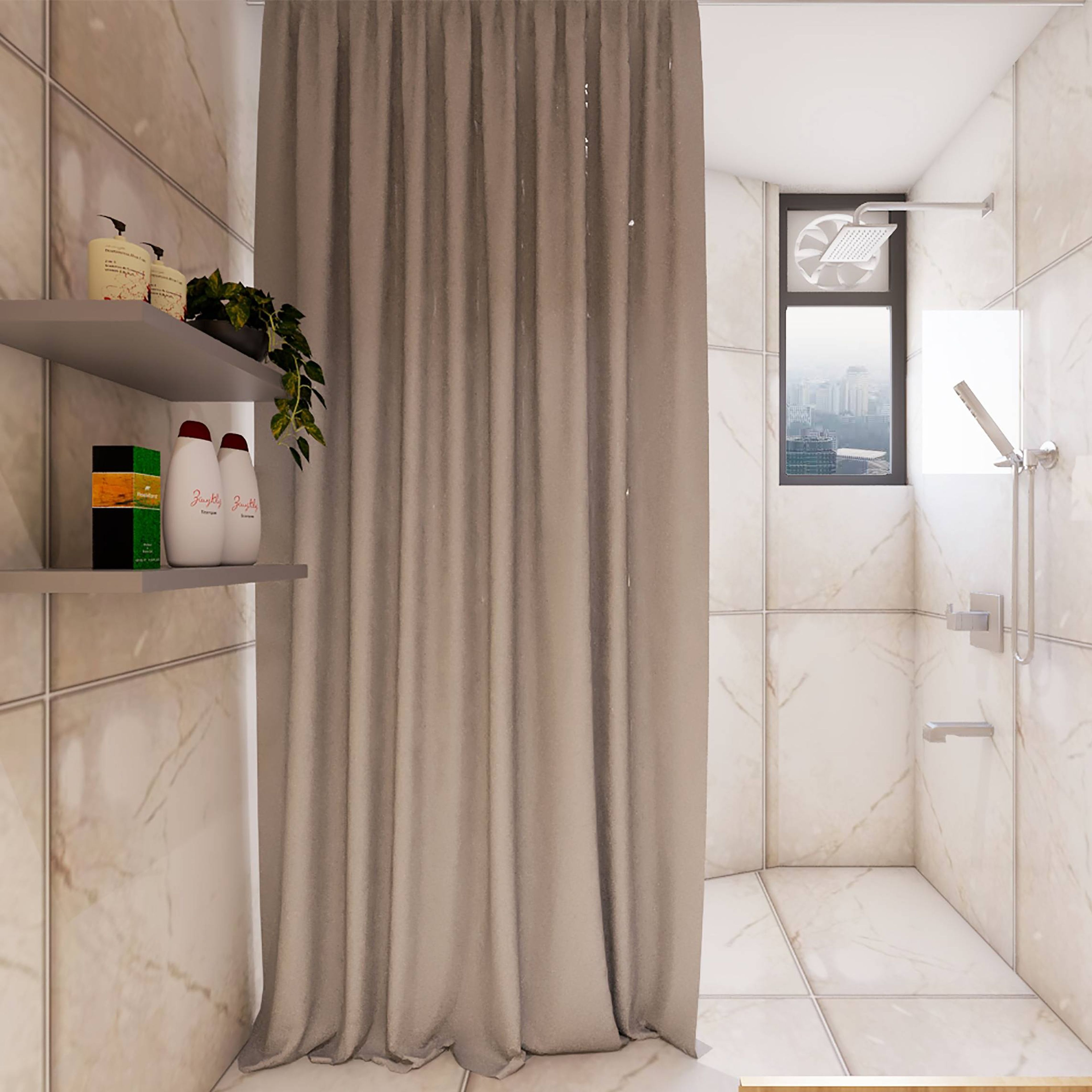 Bring about convenience and style to your home with this bathroom design that follows a modern theme. The black countertop against the white finish on the vanity section adds a good contrast. This bathroom is complete with a white tabletop basin and WC.