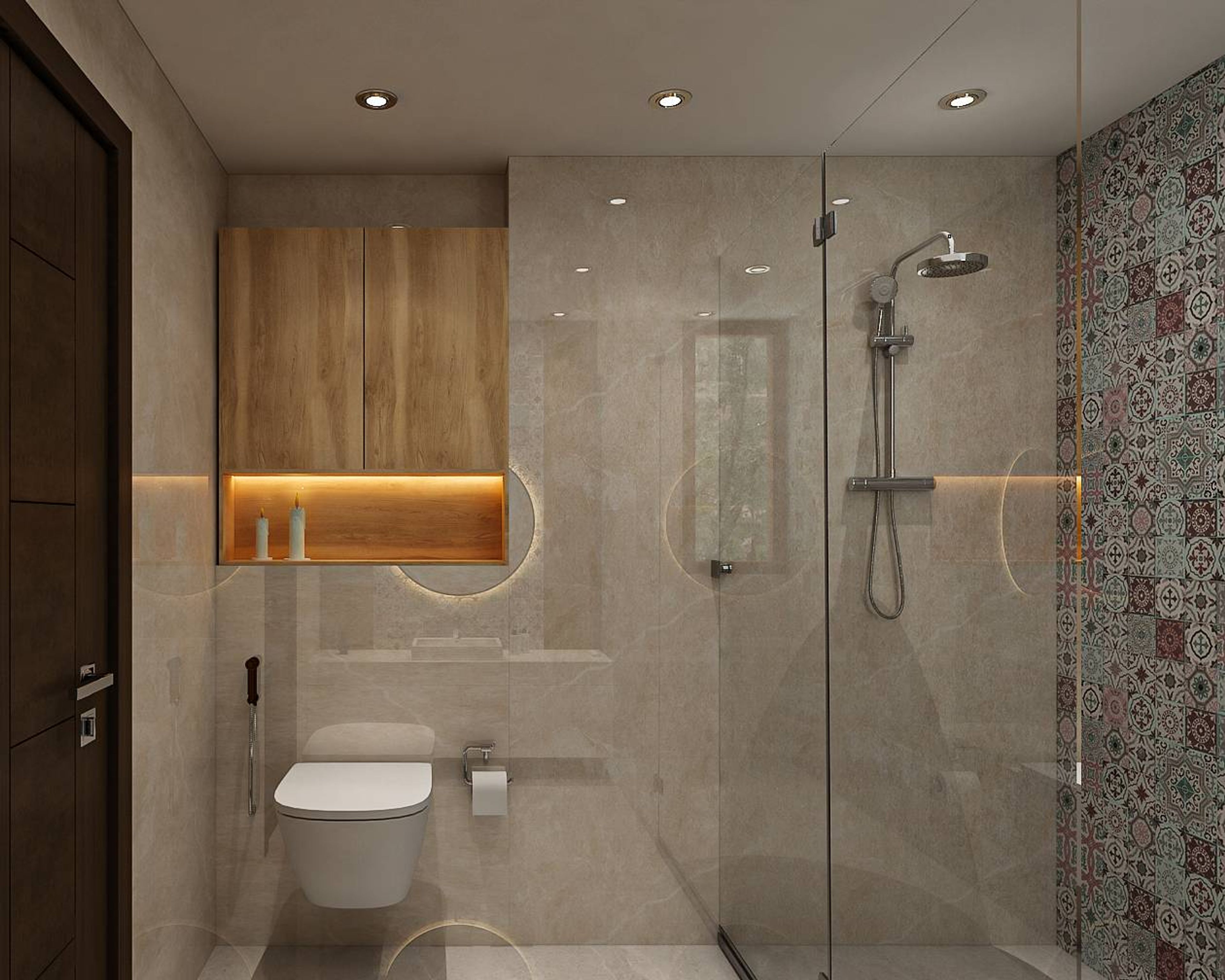 This modern bathroom design is a slice of the good life. The sleek design complements the beige finish walls, while the white marble countertop with a square countertop basin brings effortless style to the decor. It has multicolour wall tiles with wooden panelling on the sides. An overhead wooden storage unit with a strip light on the open shelf looks elegant and elevates this new-age décor.