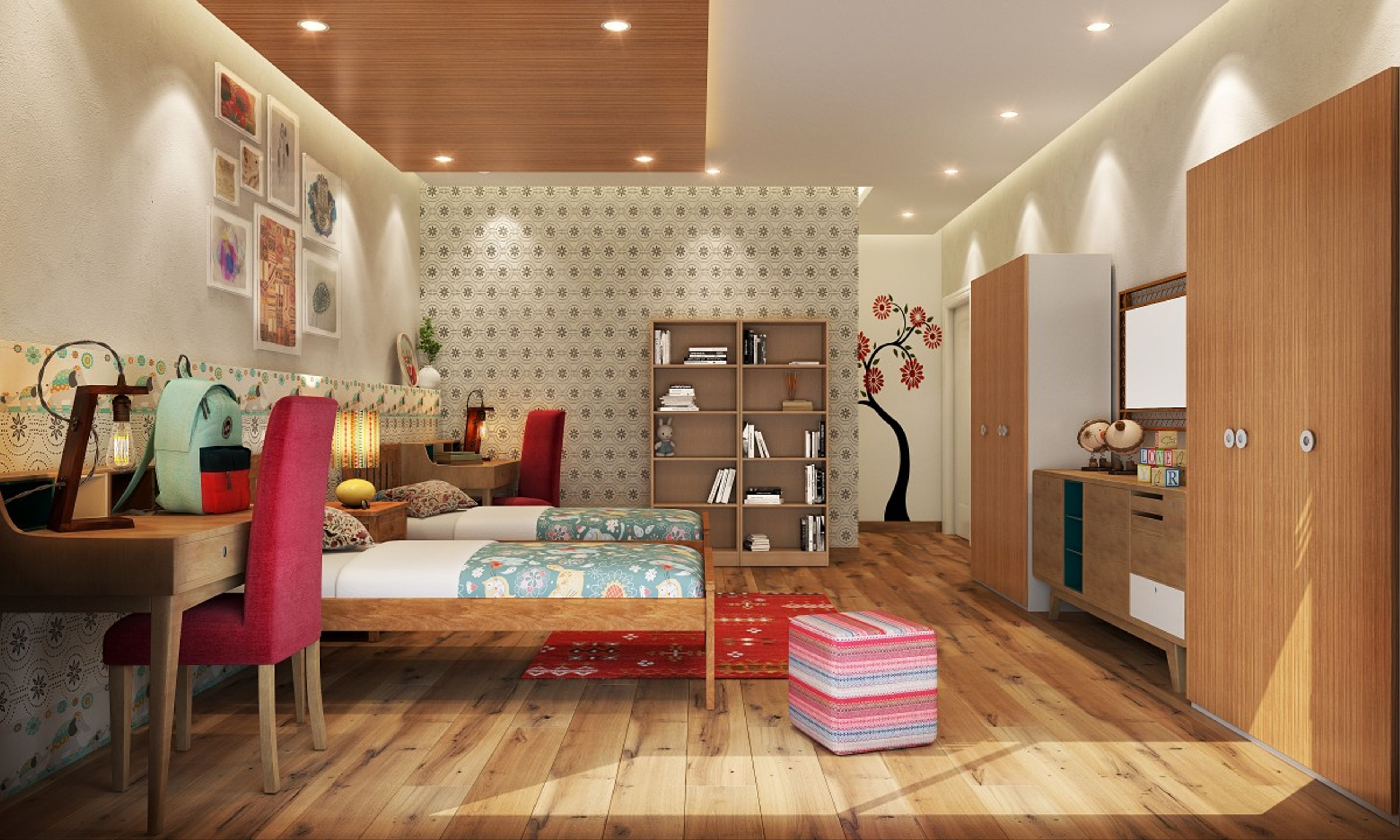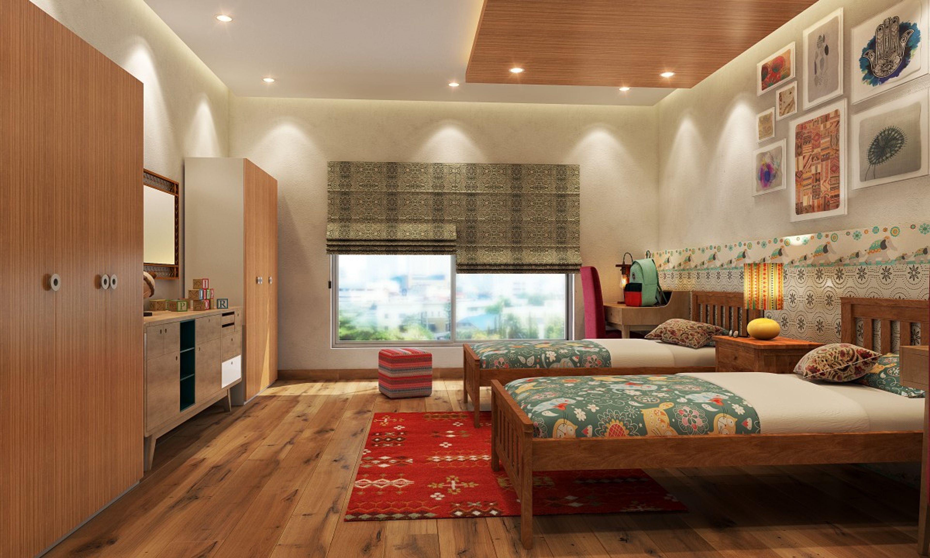 This neutral, fun-loving kids’ room is packed with quirky elements and pops of color that exude a sense of freshness.   Thoughtfully picked furniture comprise identical study tables and twin beds that complement the handy Wellington side table. A delightful collection of art prints complete the space.