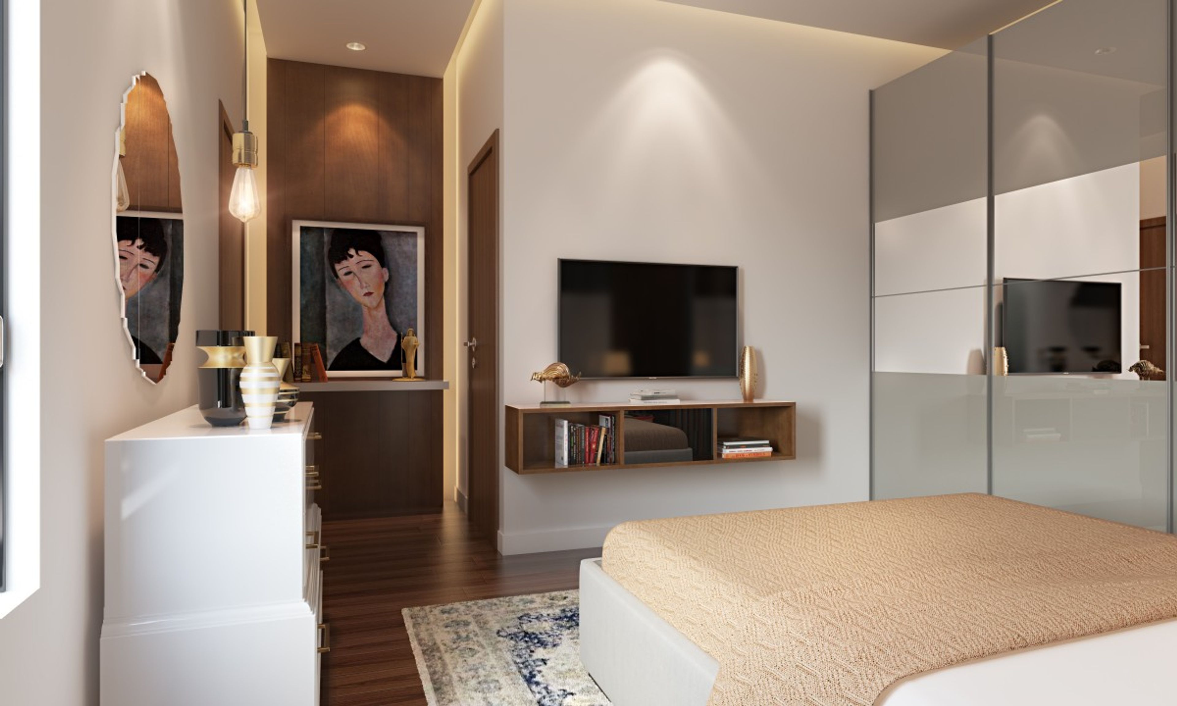 With soft hues and glimmery surfaces, this bedroom is befitting of a luxurious retreat. We love how the enchanting accent wall creates an illusion of depth.