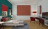 This beautiful bedroom shows you that white accents are not necessarily spartan and cold.The symmetrical arrangement of the bed with two tables on either sides creates a feeling of safety and stability.A rush of mahogany is used to temper the white creating a steady balance of colours.The armchair in the corner is the perfect place to curl up with a good book.