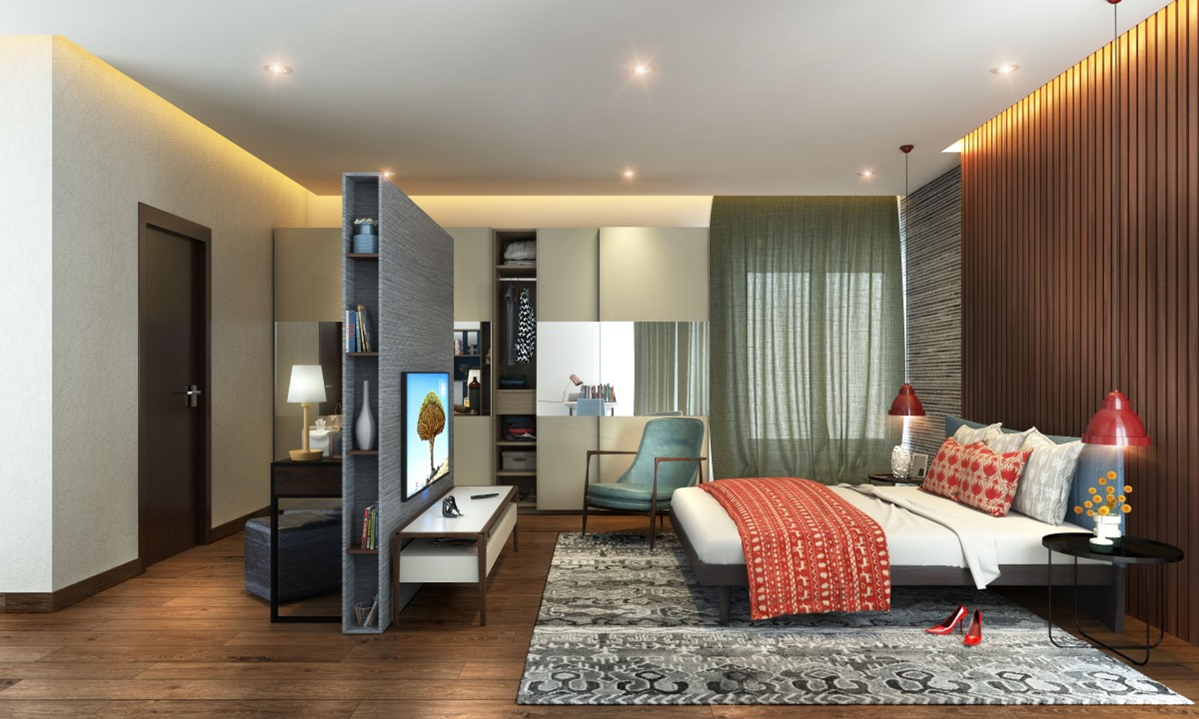 Layered with textures, and pops of color, the grey and white scheme of this bedroom invoke charm and tranquility.   The grey-blue grass textured divider and accent wall create dimensional intrigue. The organic divider creates a cozy bedroom on one side, and a private dressing space, on the other. The Raaga table is paired with the Kashi pouf that provides a whiff of glam.The Ripple king bed centred on the edgy Petra rug accentuates the bedroom without overwhelming it.