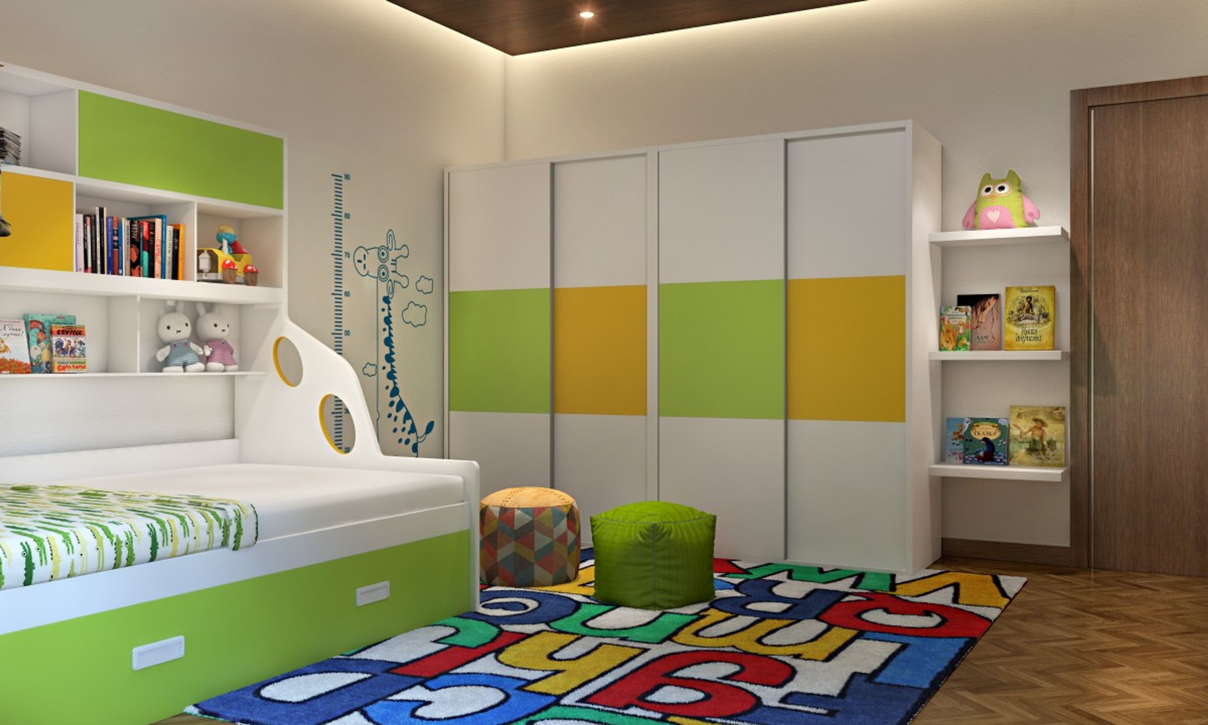 Energetic neon accents give a bright touch to this kid’s room that has it all - a study corner with the Dalton table, a multipurpose Piper trundle bed and a small tent for adventurous playtime.   An alphabet rug adds an array of fun colors to brighten up the space and large windows ensure proper ventilation. With multiple shelves and storage nooks, there is an abundance of space to store books, stationery, toys, bedding essentials and more.