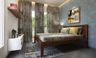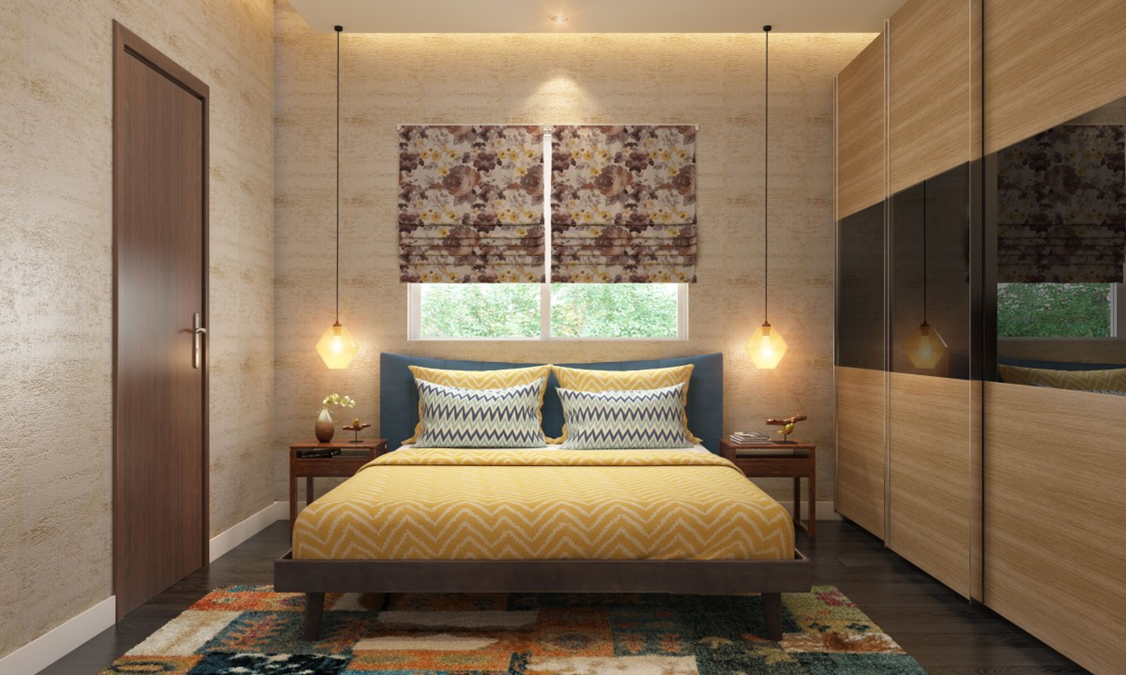 Beauty is in the details of this cozy haven - lightly cerused walls, expressive wood finishes, complete with cheery pops of yellow.   A TV unit with a floating shelf that doubles as a desk and a large, sliding-door wardrobe with a mirrored surface are some of the versatile features in this space. Chic pendant lights on either side of the bed and a large window behind provide the right illumination for reading or working on a laptop, whether it’s day or night.