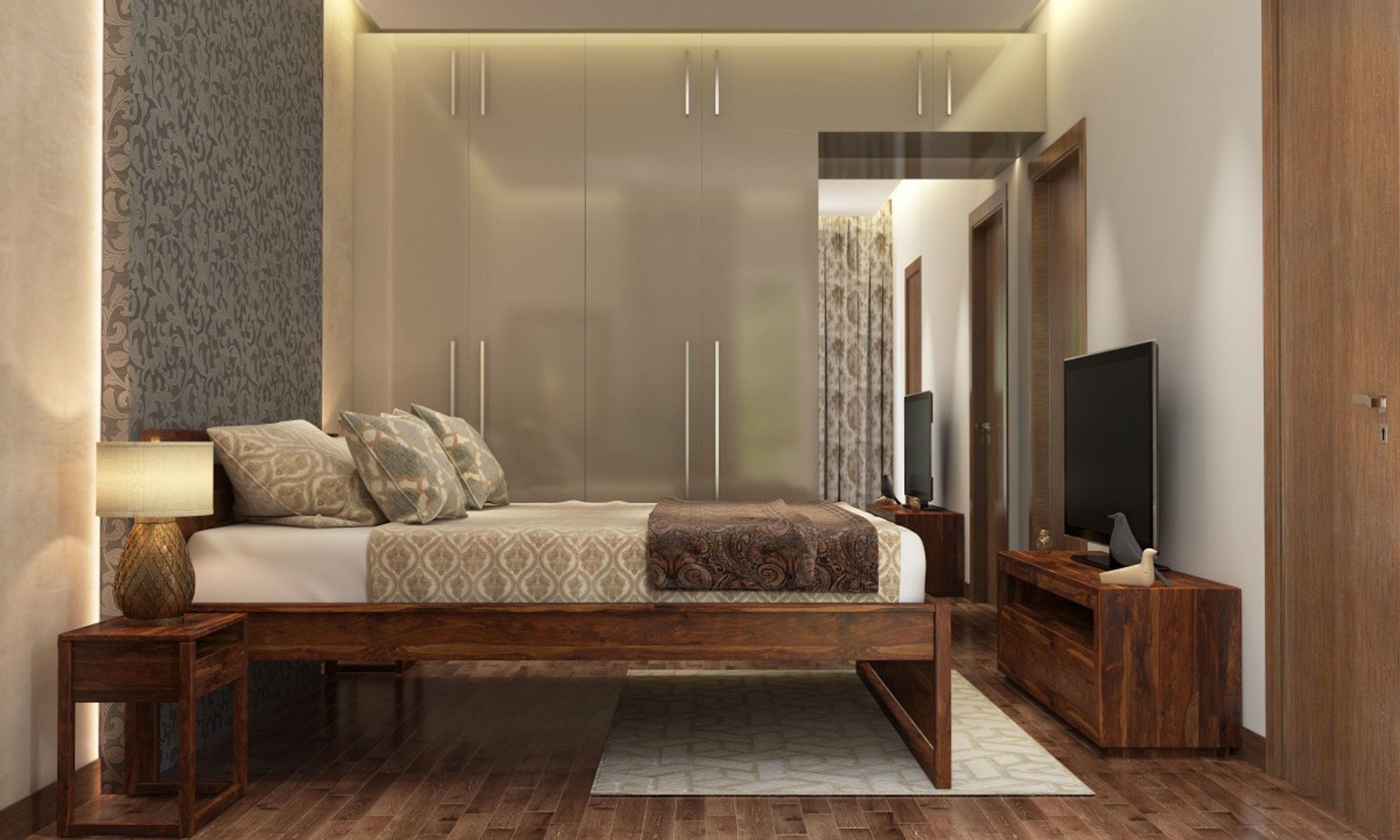This plush master bedroom is enriched by the rich wooden tones of its furnishings and the aesthetics of the decorative brass elements.   Flanked by two Freya bedside tables is the Freya king size bed which is luxurious in every form. The Hemingway study table, Mansfeld sideboard and TV unit provide ample space to house essentials.