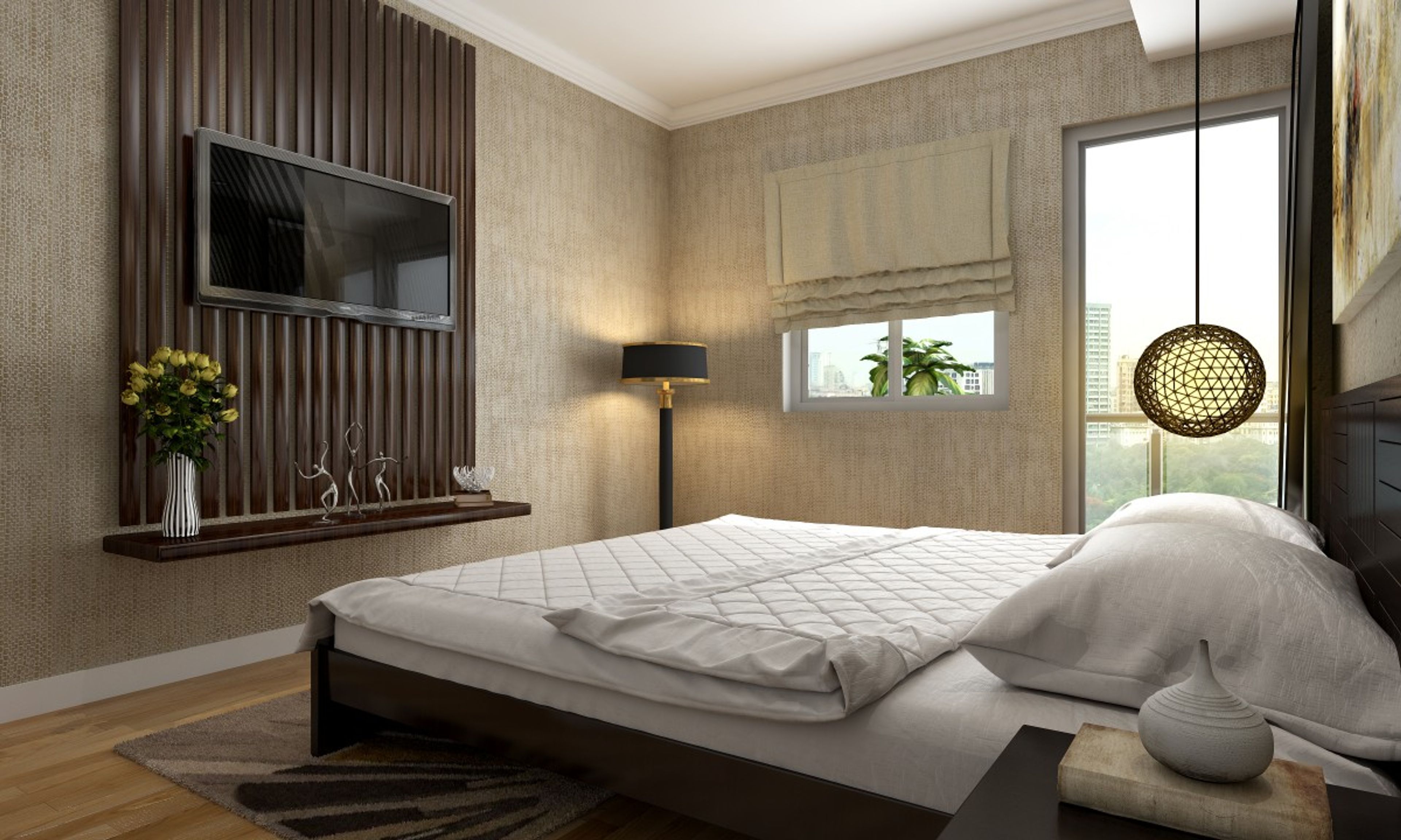 This tranquil master bedroom is a combination of refined grace and comfort, captivating you instantly with its inventiveness.   The impressive abstract art piece distinctively stands out against the cerused wall, while the Fairview bed flanked by  the Harper set drives the contemporary flavour of the space.