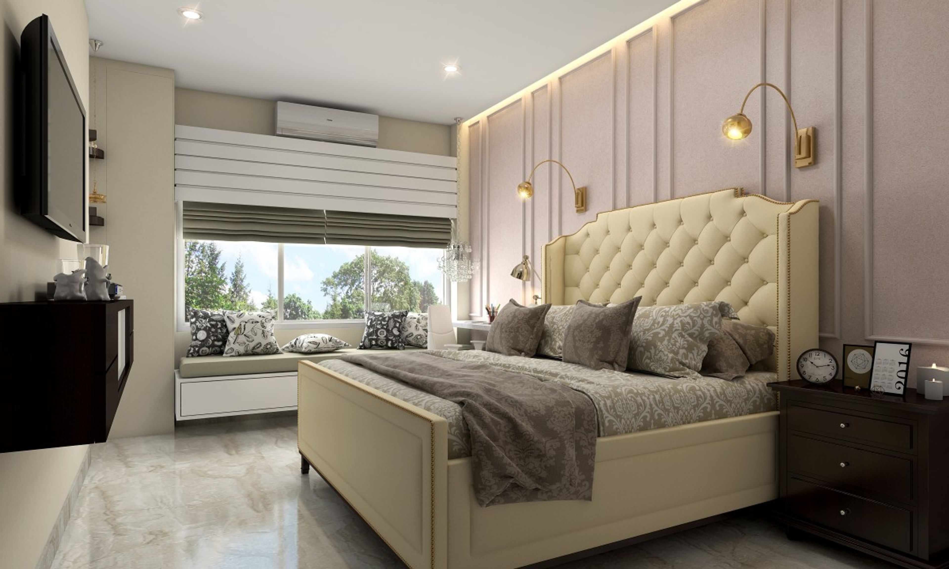 Dreamy pearl hues in this suave bedroom lend it an old-world charm and highlight its subdued grandeur. Wall sconces illuminate the majestic wingback ivory bed while the muted tones offer this room an aura of absolute comfort. A large wardrobe provides storage space for essentials. Includes furniture, accessories, and soft furnishings, all subject to availability