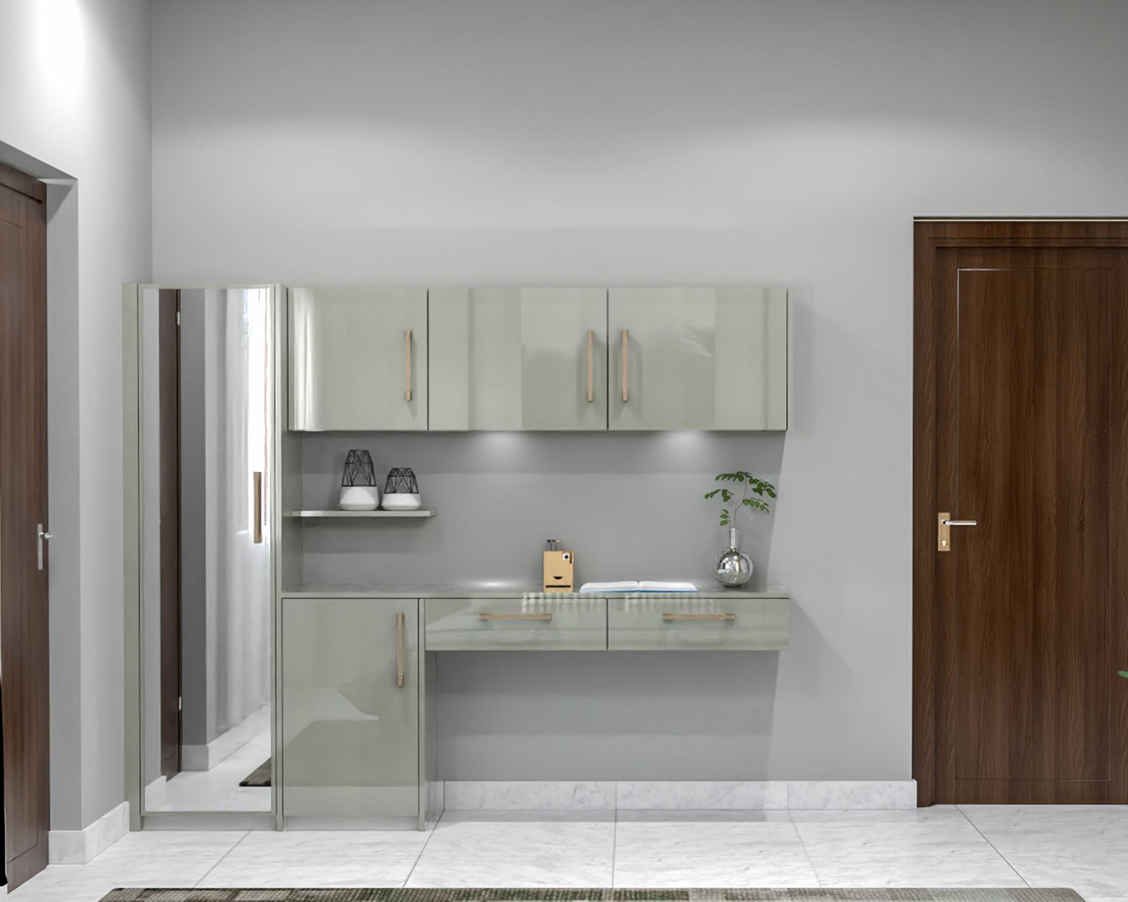 Get a contemporary upgrade in your master bedroom design featuring grey walls and artistic frames. The black and white theme used in the wardrobe and bed is timeless. This bedroom is well planned with furniture placed appropriately.