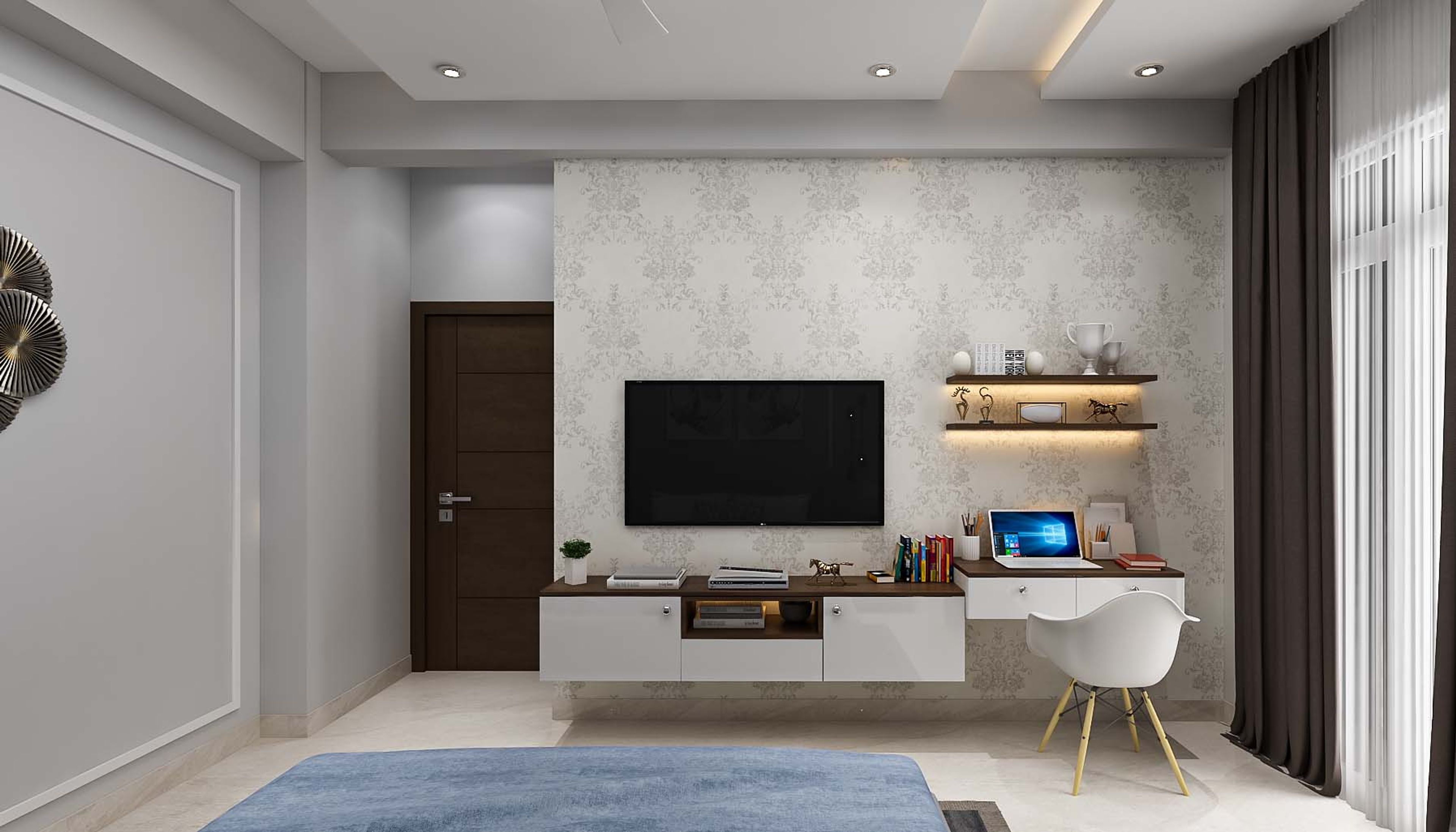 Your nights will be comfortable and mornings filled with ease when you rest and wake in this modern bedroom. The design comes with a grey wall accentuated with white panels. The bed has a high headboard and is upholstered in the same shade of grey. This room is spacious with mirrors and a study desk.