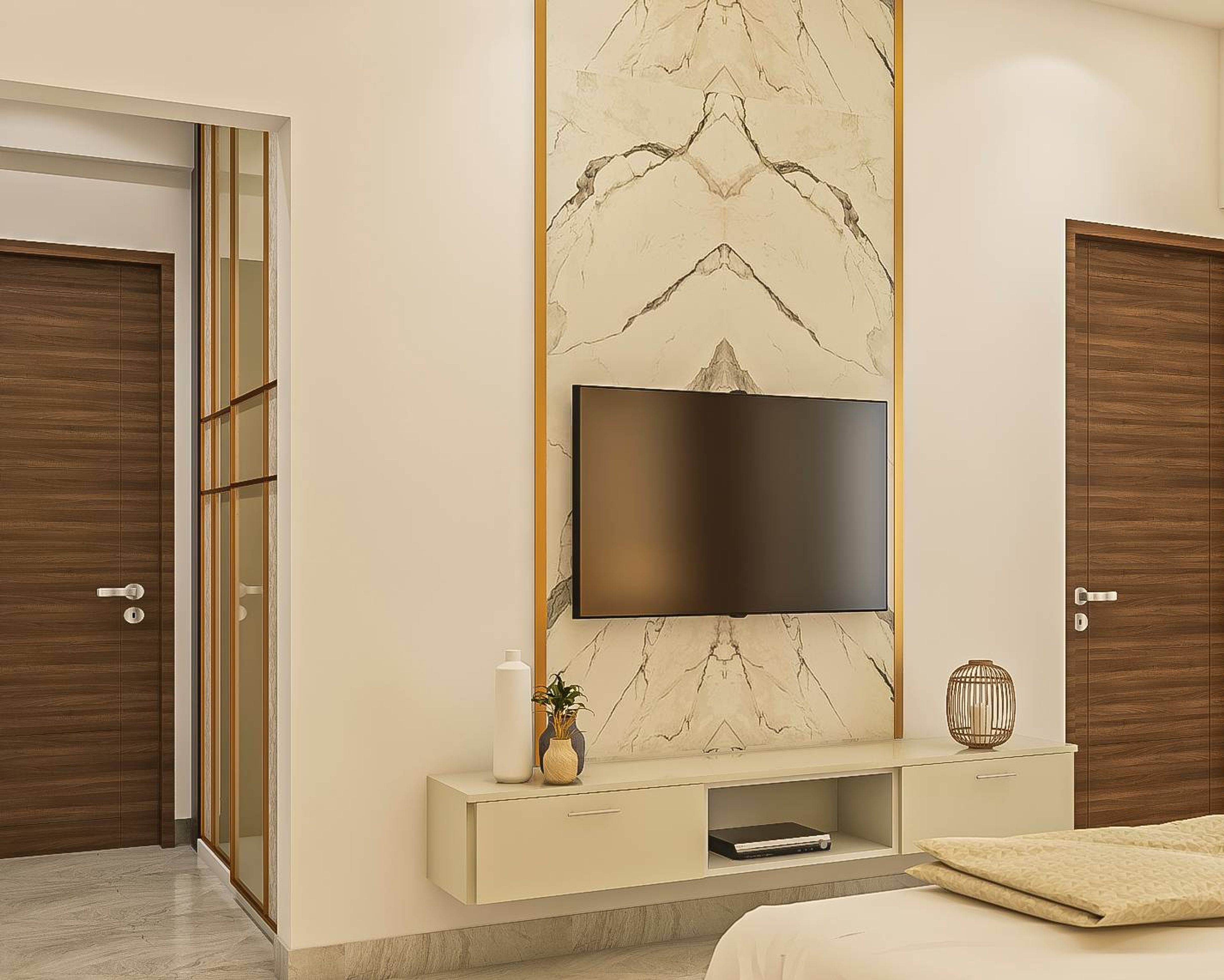 This classic master bedroom design has chic interiors. The TV unit with a marble backdrop wall is covered with golden trims. Two bedside tables are also provided for storage. The ambient ceiling design with white colour temperature complements the design style of this room. The golden legs of the white side table give a classy look.