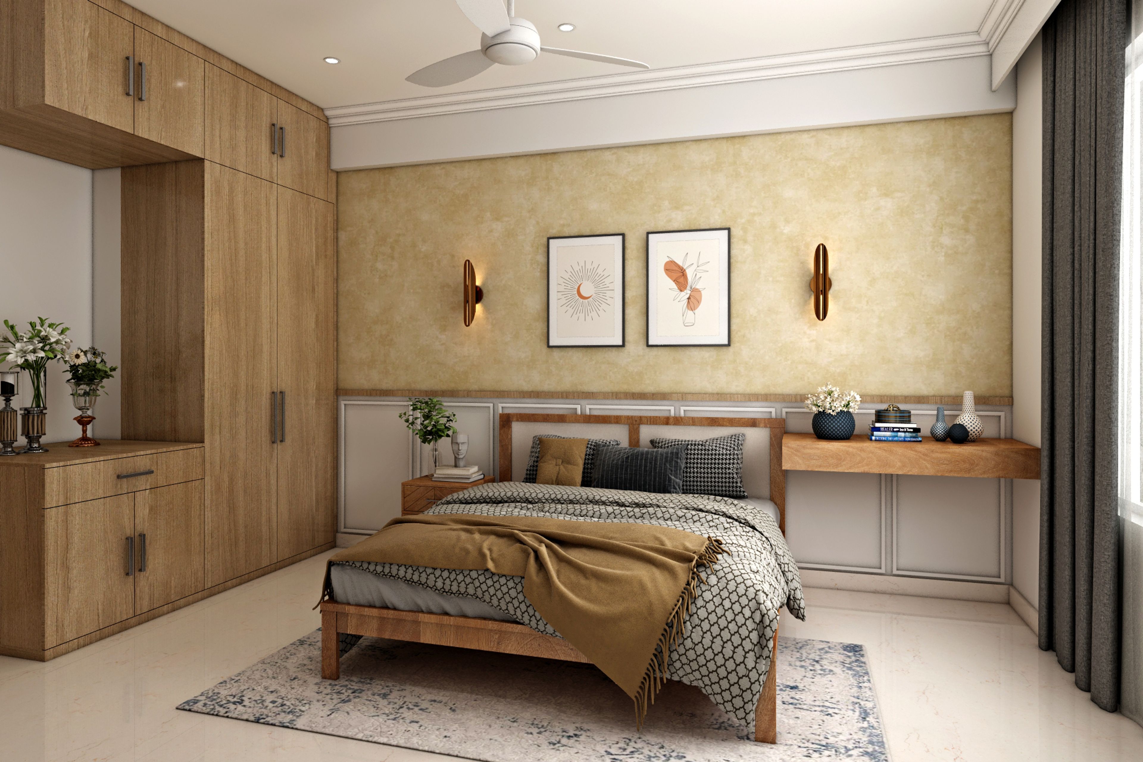 Ideal for lazing the day away, this classic-style master bedroom features golden light fixtures on the wall that adds luxury to the space. The textured beige wallpaper with grey wainscoting creates an inviting look and feel. Beautifully classic, it is separated by wooden beading that offers a sense of privacy and modesty. The wooden grain laminate finish on the wardrobe maintains the item’s durability and strength. It provides drawer units that can store your clothes and accessories. A cornice detail on the ceiling lends visual interest to the bathroom space.