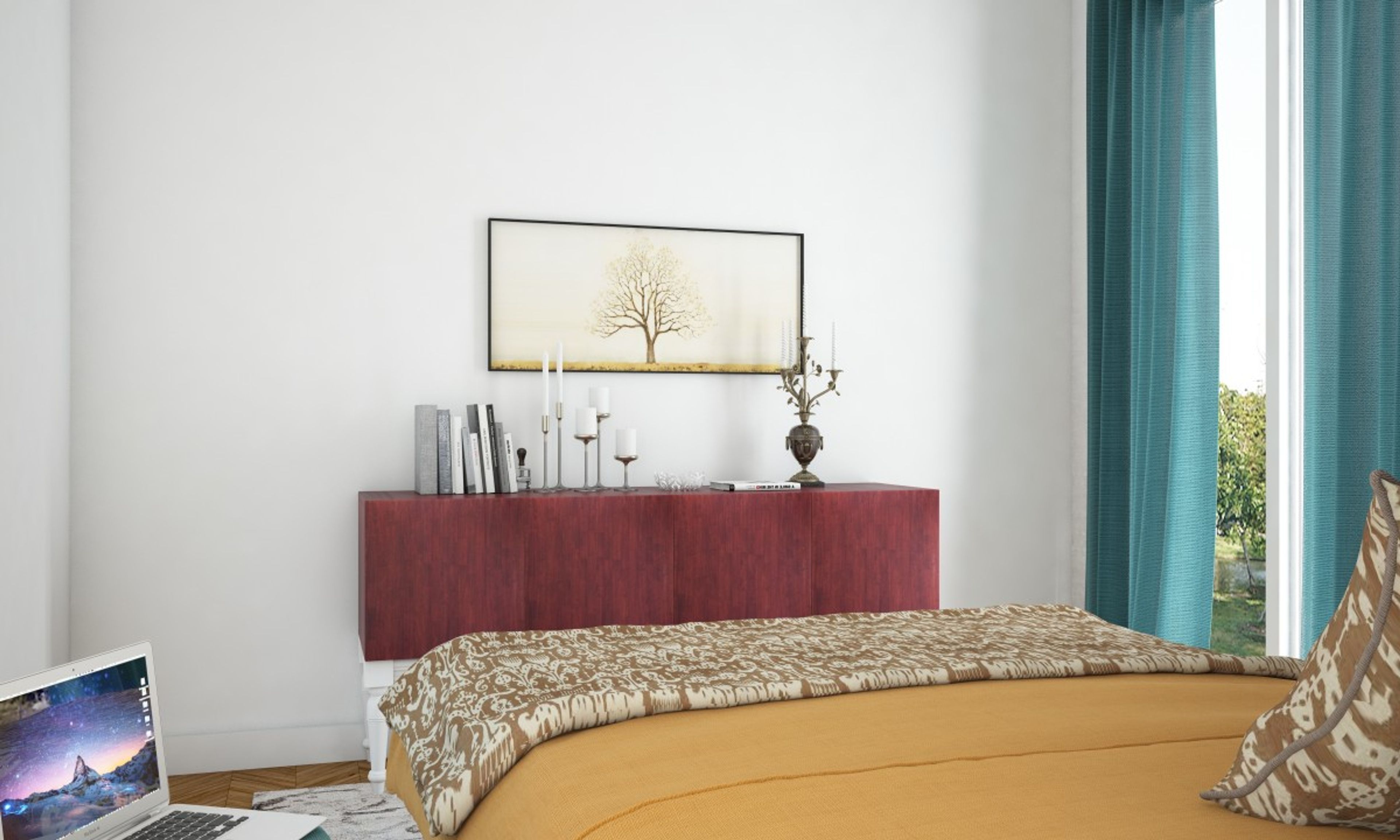 Symmetry and classical embellishments come together to create a lavish feel in this stunning bedroom. An elaborate circular mirror highlights the Sagrada queen size bed, which forms the focal point of this room. Two Julia pendant lights frame this setup, creating a balanced harmony.  An elegant footstool accompanies the arrangement - a perfectly functional complement to the refined furnishings.