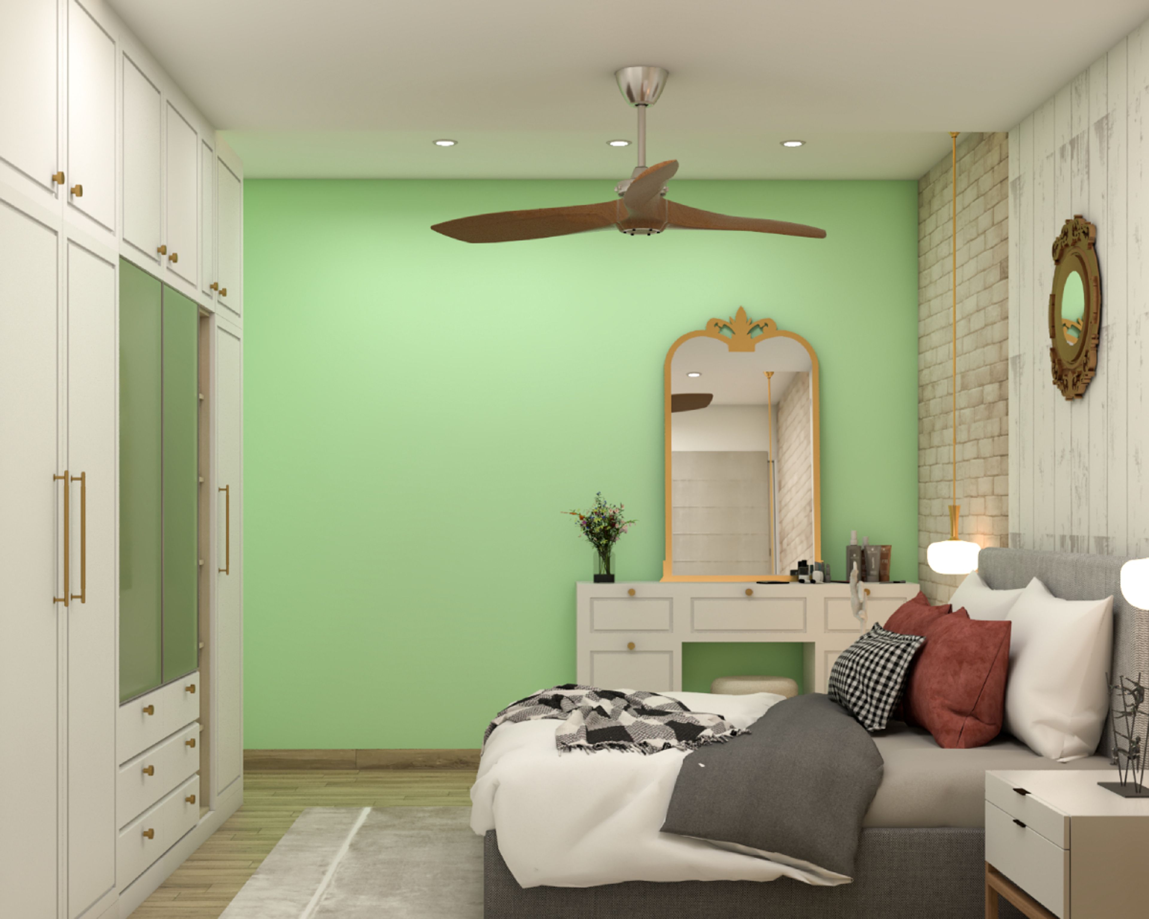 The stunning brick patterned wallpaper on the accent wall makes this master bedroom design a classic yet timeless one. The dressing unit has a rustic finish and comes with a good amount of storage space in the multiple drawers. The unit also includes a classic tabletop mirror. The room is complete with two bedside units around the bed.