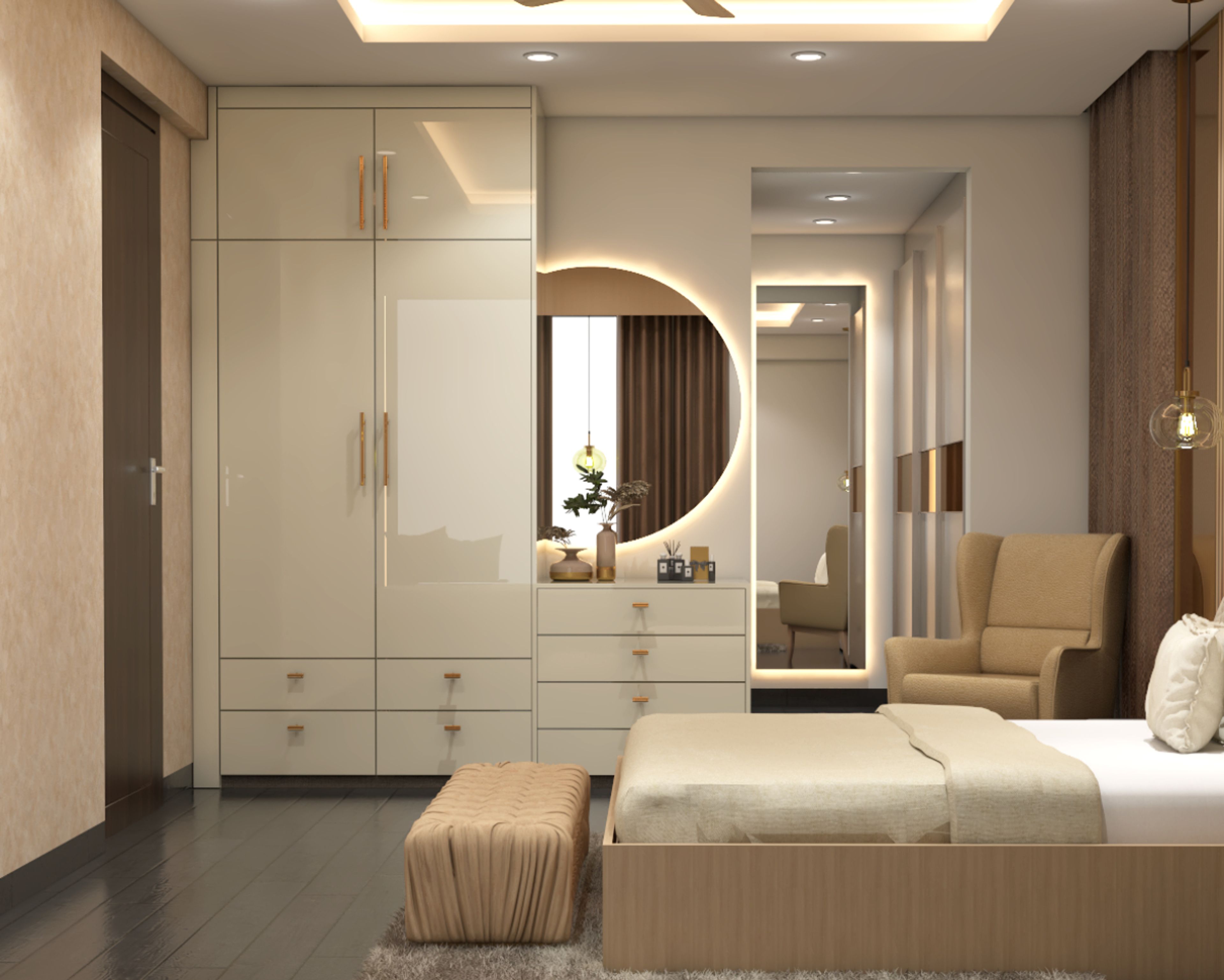 • Room Highlights: Spacious bedroom design with good storage and warm lighting
