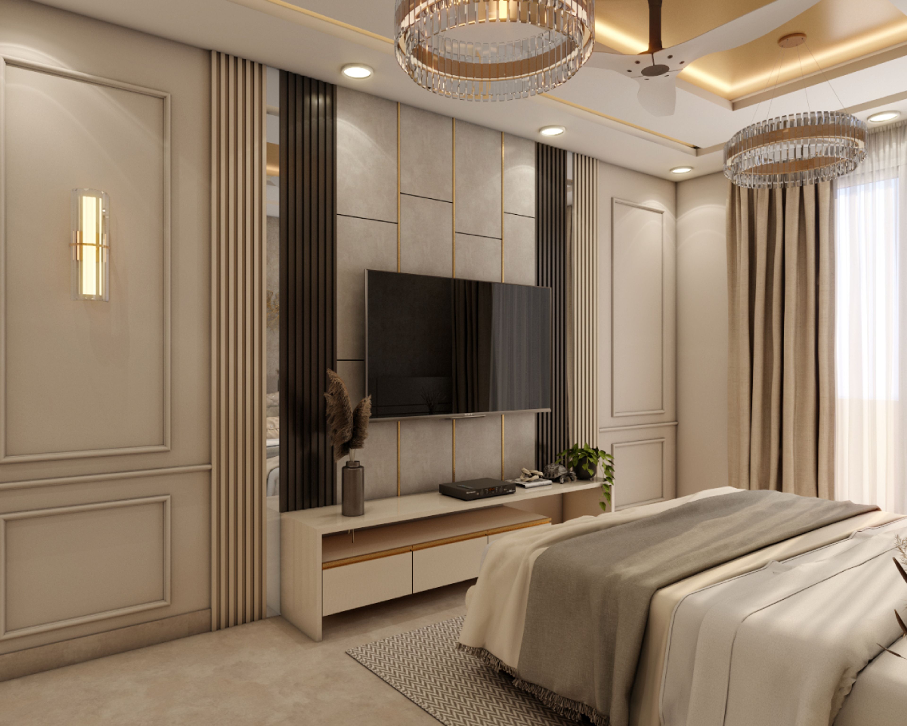 Contemporary Beige Master Bedroom Design With Golden Inlays
