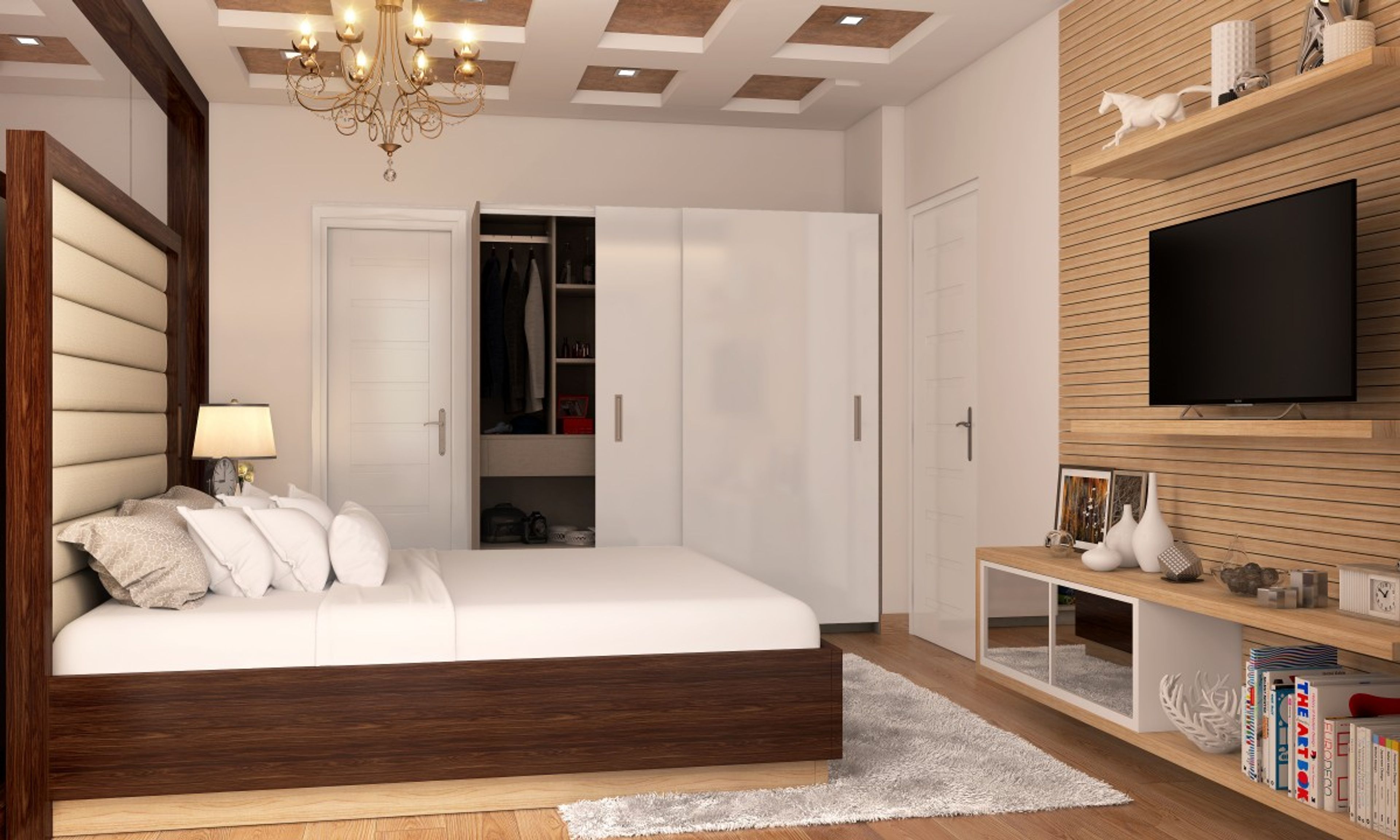 A master bedroom offers clear zoning between the sleeping area, wardrobe, and dressing nook. It enhances privacy, optimizes furniture placement, and provides efficient use of space — ideal for both compact and large homes.