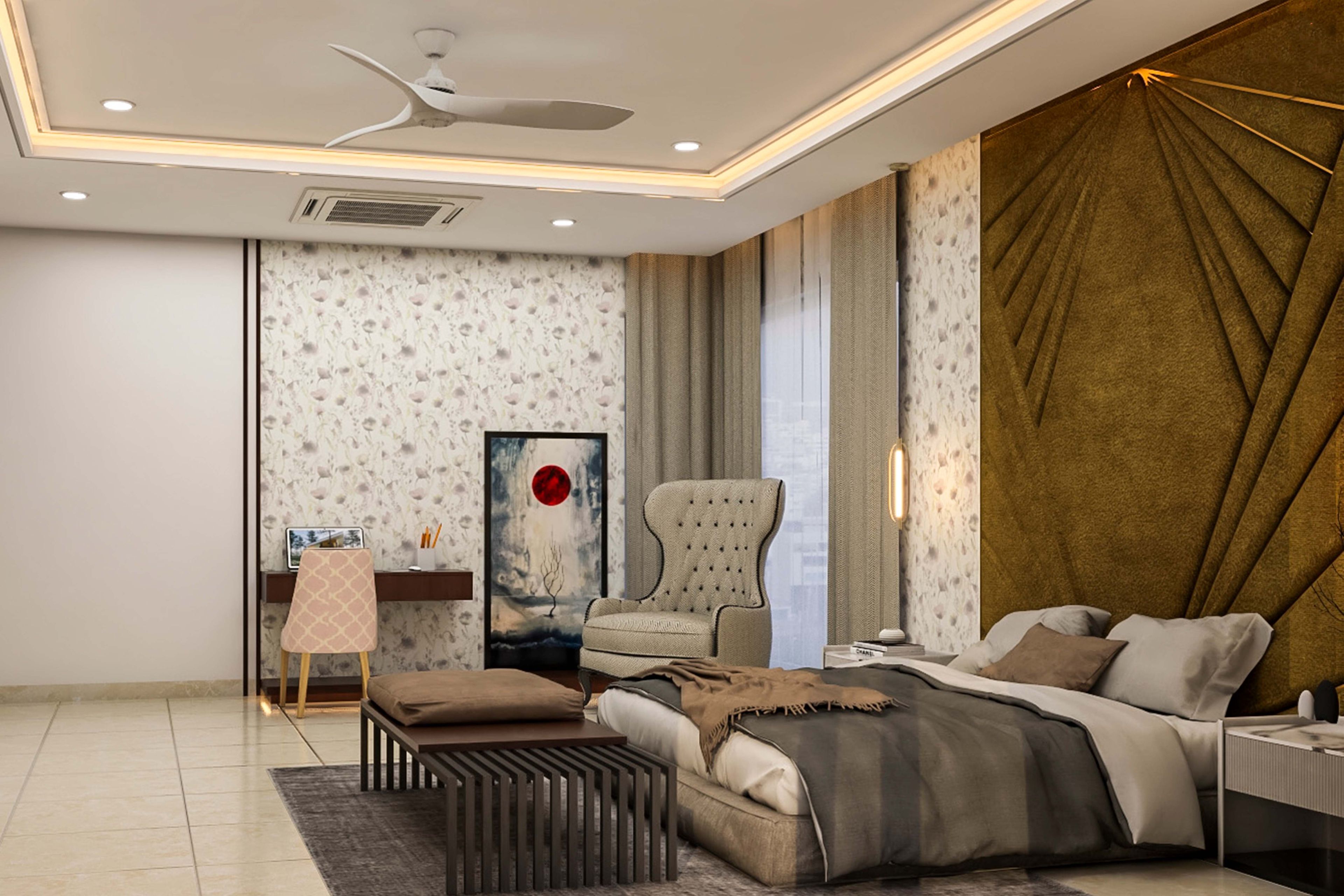 Give yourself a perfect blend of comfort and style by selecting this design for the master bedroom. The accent wall in this room is styled with a large section of a brown panel and golden strips. The room is furnished with an accent chair and two bedside units. For multifunctionality, a desk and pink chair is also included in this space. At the end of the bed, a table is placed.