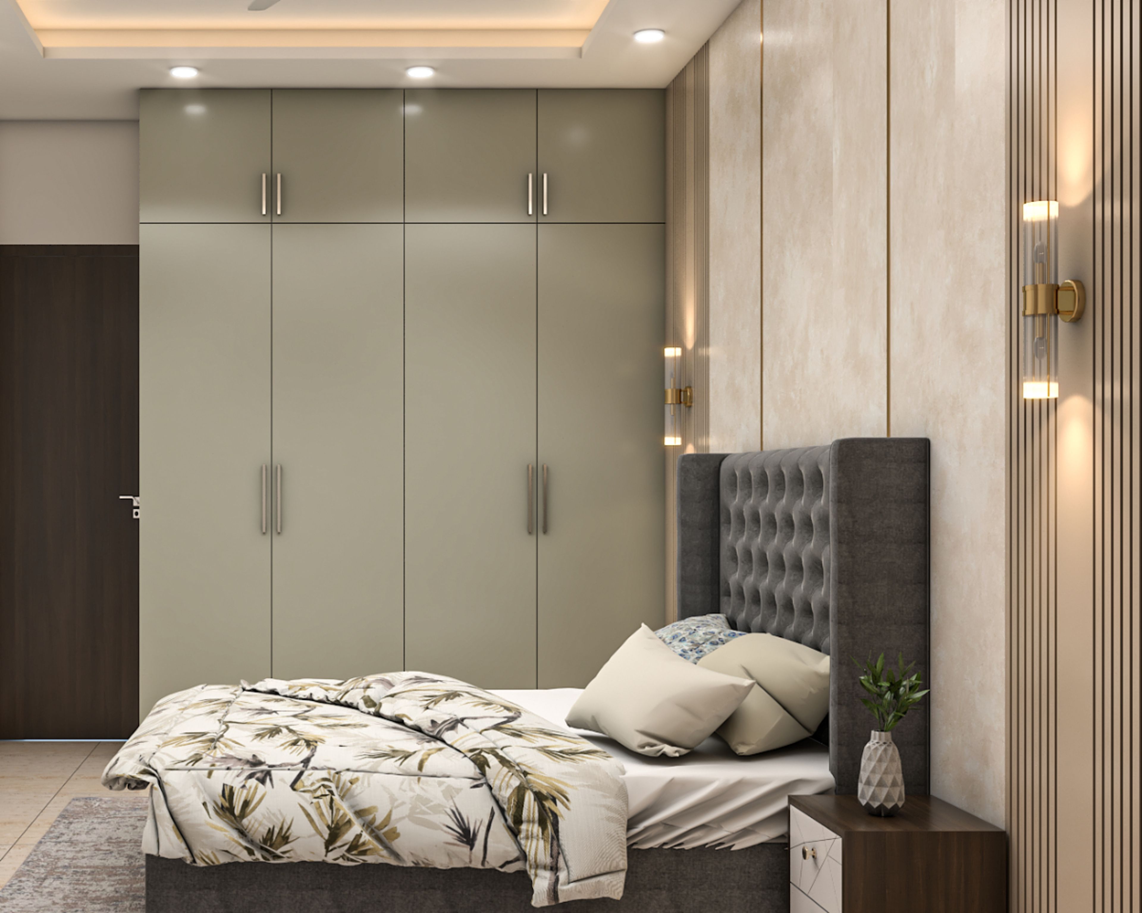 With its sleek and stylish aesthetic, this master bedroom design exudes elegance and class. The bed's back wall is treated with beige wallpaper, which complements the grey bed's back panel perfectly. The tufted grey bed back panel lends a touch of luxury to the bedroom, while the green wardrobe with golden handles adds a touch of class. The green wardrobe is further complemented by the golden inlays, golden light fixture, and golden wardrobe handles, which add a touch of contemporary style to the bedroom. Overall, the master bedroom is the perfect place to relax and unwind after a long day.