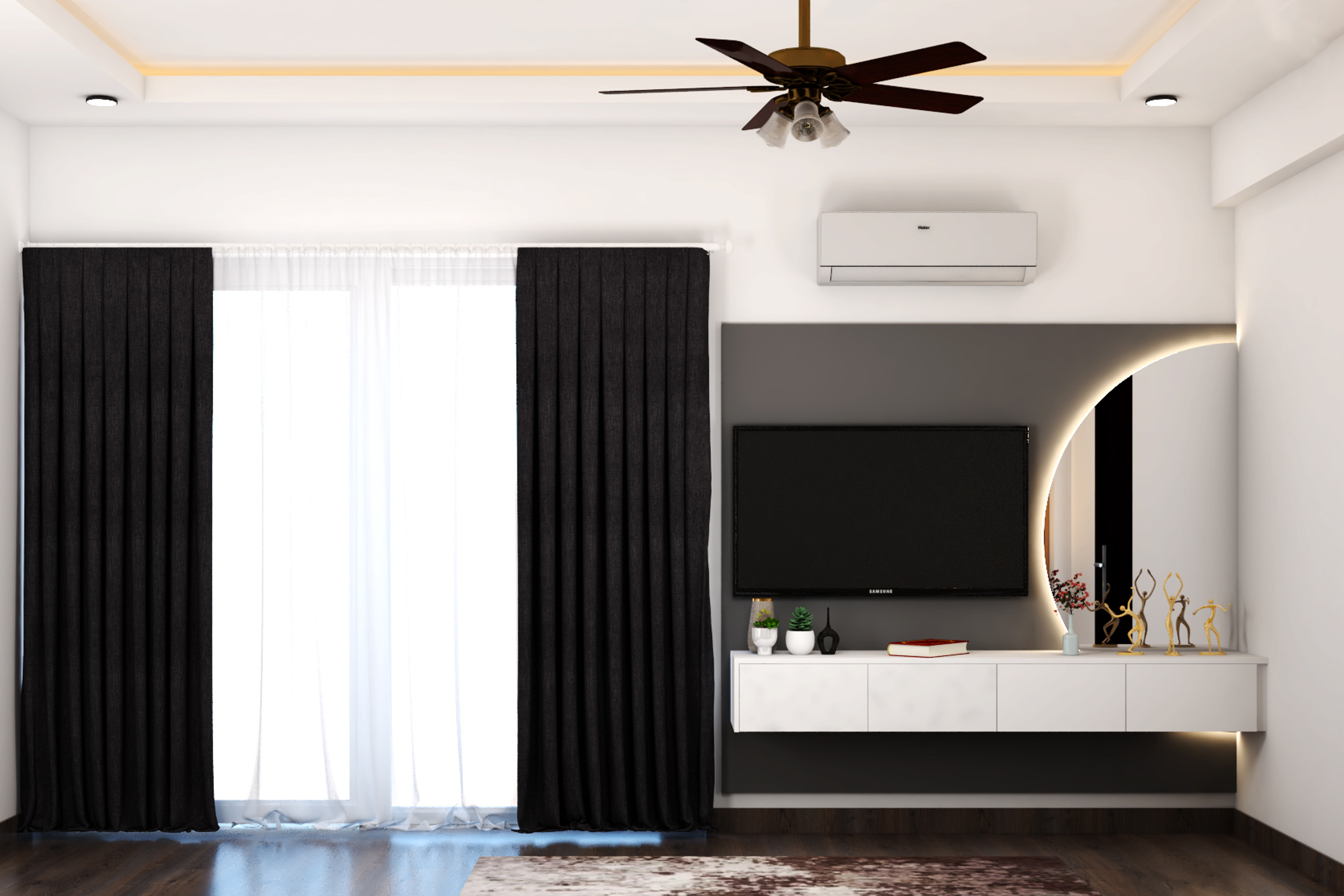 This master bedroom design is for those who appreciate contemporary art. The vertical panelling and grey finish combine to make the space look classy. This bedroom design is multifunctional with a TV unit and curved mirror frame.