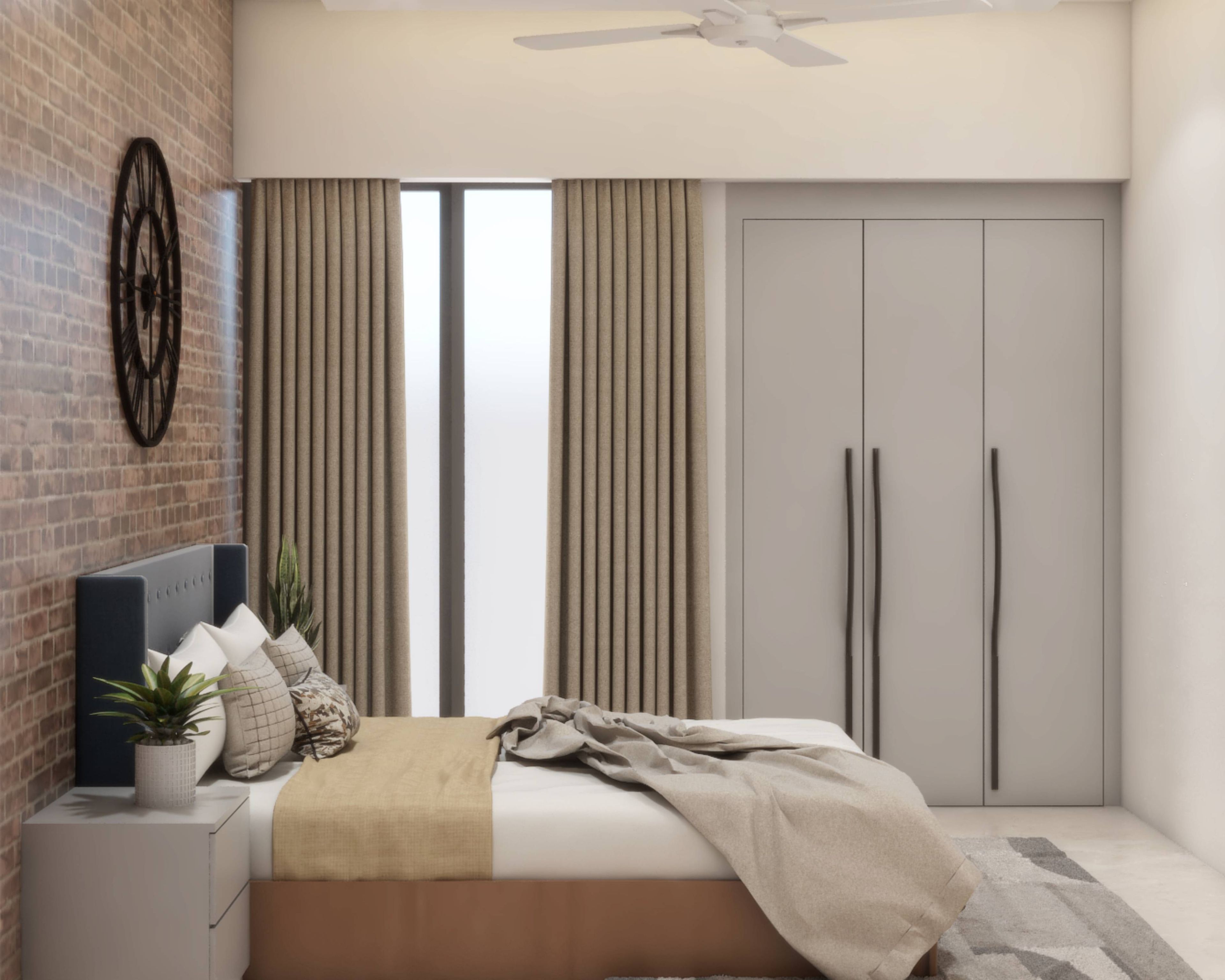 A contemporary master bedroom designed for compact spaces. The brown upholstered bed with an inbuilt blue finish headboard and white side tables look good. The brick-textured accent wall has an oversized clock. The grey finish wardrobe is integrated into the wall for a seamless look.
