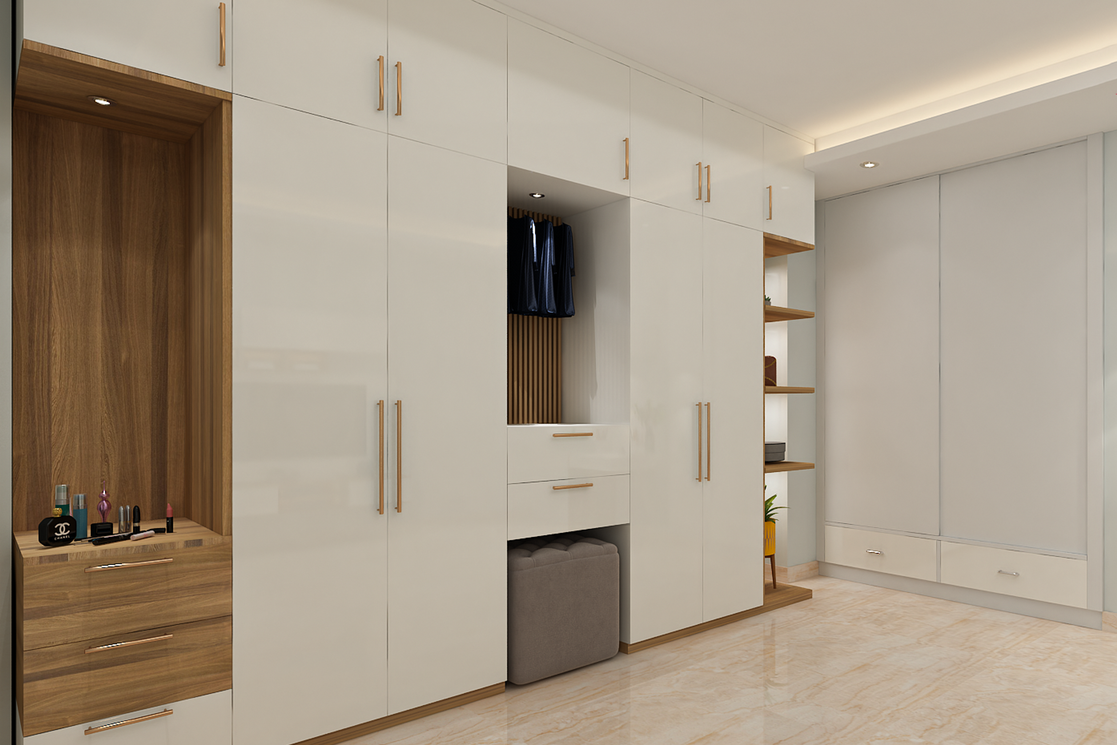 This luxurious master bedroom design has a spacious layout to accommodate all facilities like study, TV unit, and wardrobe. The premium white wardrobe design with wooden handles is complemented by the wooden dressing area. The wardrobe unit has maximised storage as well as a make-up table and open shelves for user convenience. The off-white bed with headboard gives maximised comfort and gives a rich look with golden trims on the brown accent wall. With separate areas designated for sleeping, wardrobe, and dressing, this master bedroom gives you the best design for a spacious layout.