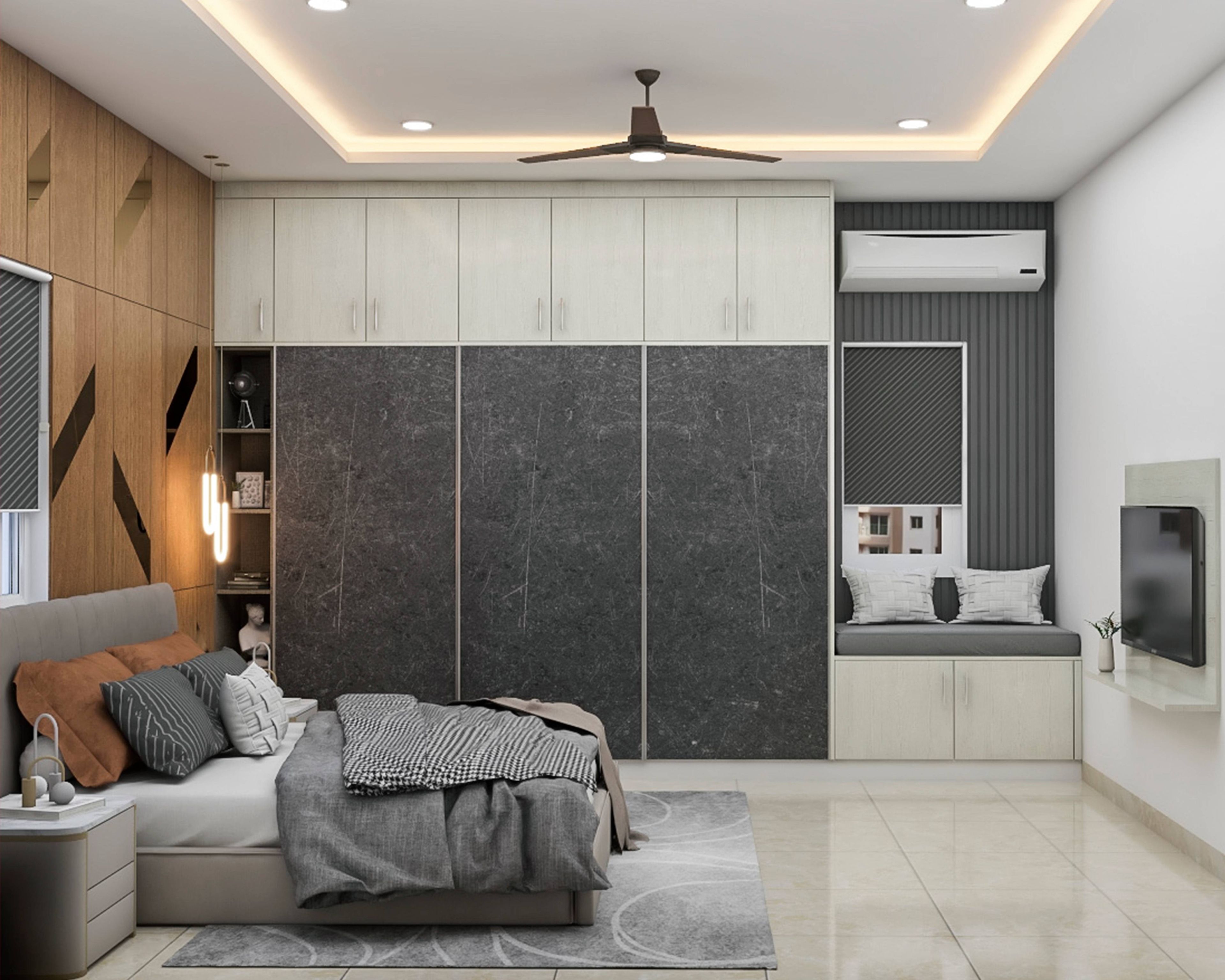 • Storage Features: Black-textured wardrobe with a pale gray loft, creating a stunning visual contrast