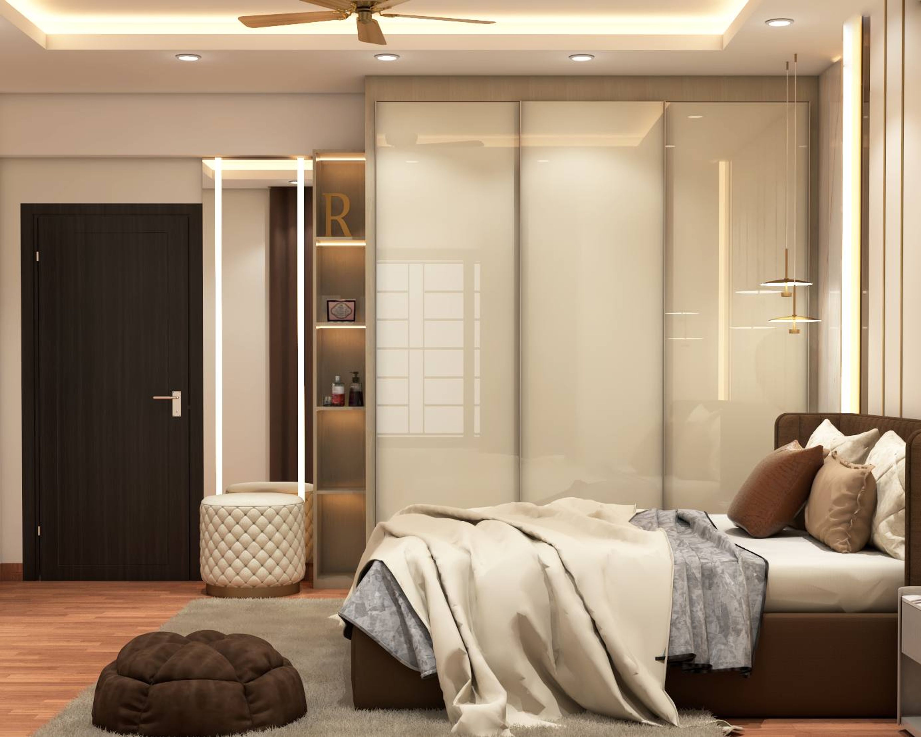 This contemporary master bedroom interior design is thoughtfully curated and luxuriously decorated. There is an accent wall made of mirrors, white laminates and marble tiles. A brown upholstered bed with a curved headboard, a mirror with LED lighting for dressing and white laminate glossy sliding shutter wardrobes make this space an ideal choice. LED lights bring the décor to life.