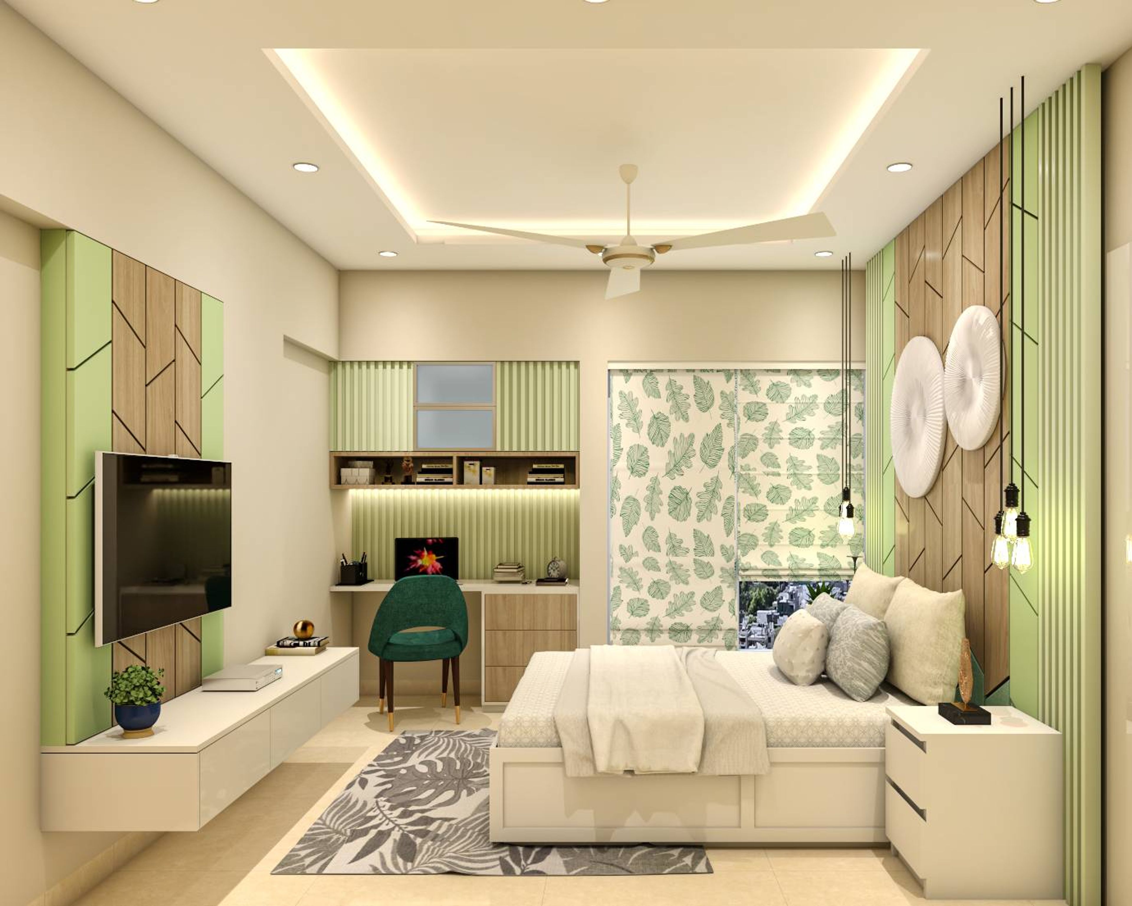 This chic and stylish bedroom features a creamy white double bed with similar finish storage bedside tables. The wooden paneling in the headboard with green panels on the side for contrast is a stylish addition to the room. The creamy white wardrobe with mirror shutters and sliding door for space saving is a perfect place to store all your clothing. The light wooden study on the side with an overhead storage unit also makes the space very efficient.