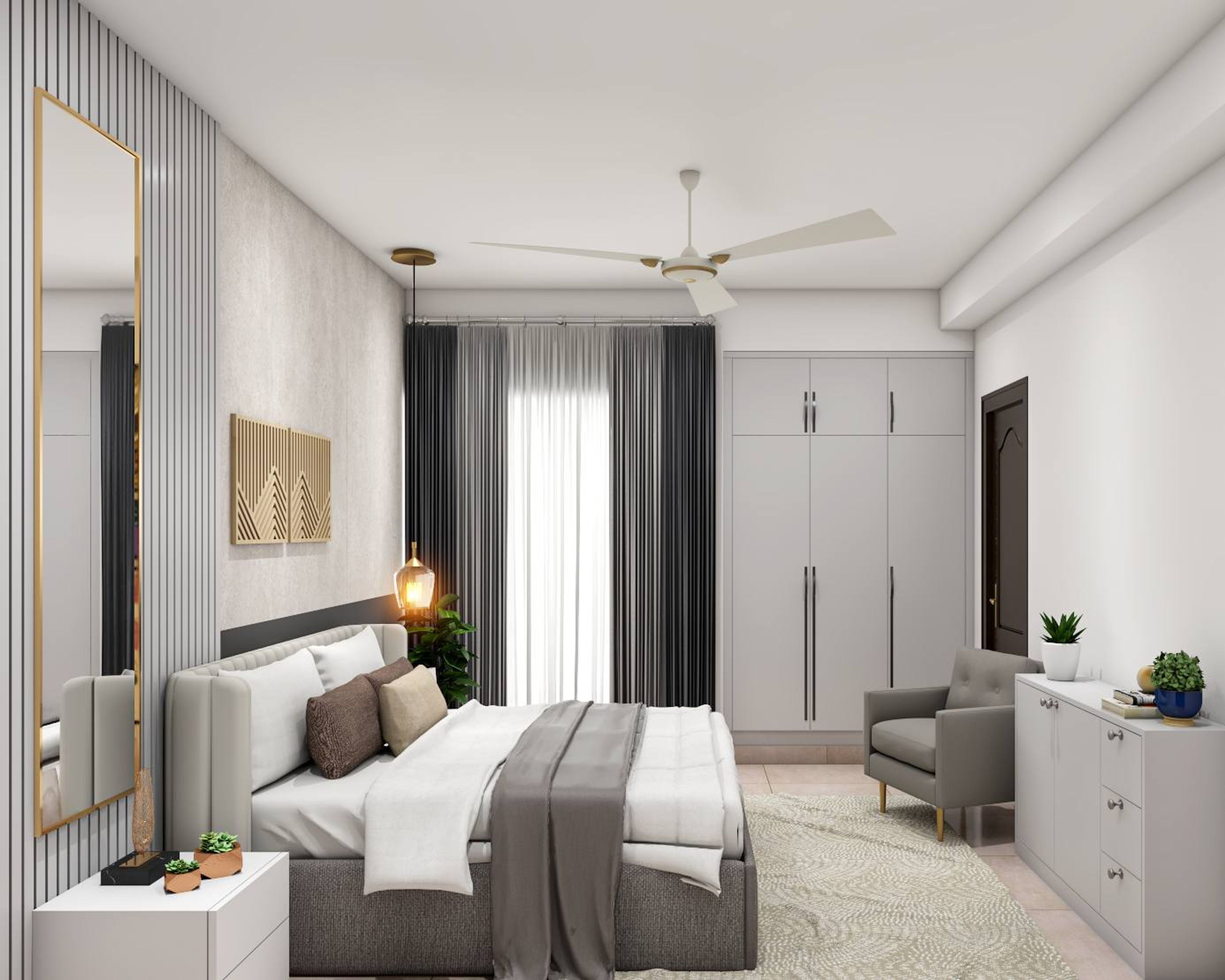 This monochromatic grey-themed master bedroom with modern decor. The interiors are timeless and elegant. The accent wall is a mix of light grey vertical panels with grooves, concrete texture and matt grey paint highlighting the wall. The inbuilt wardrobe unit with grey shutters and king, sleek handles looks good. The console cabinet enables maximum storage. The king rectangular mirror with a golden frame visually adds a spacious feel to the room.