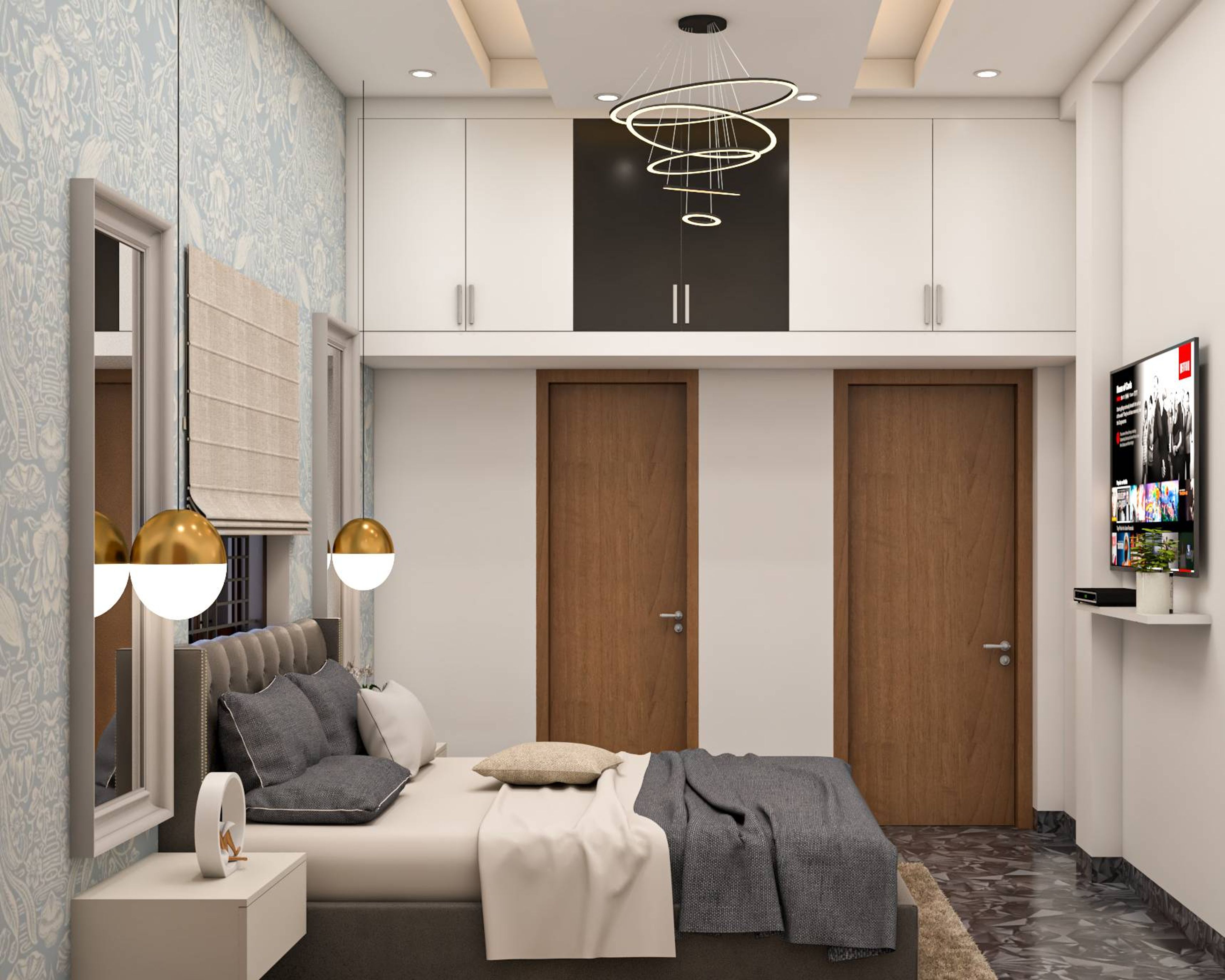 Create a cosy space for yourself with this master bedroom design featuring a pastel blue wallpaper and dark patterned floor tiles. The dark tufted headboard complements the space well. Mirrors and wall-mounted drawers are hung on either side of the bed. This bedroom has a black and white combination on the storage unit shutters.