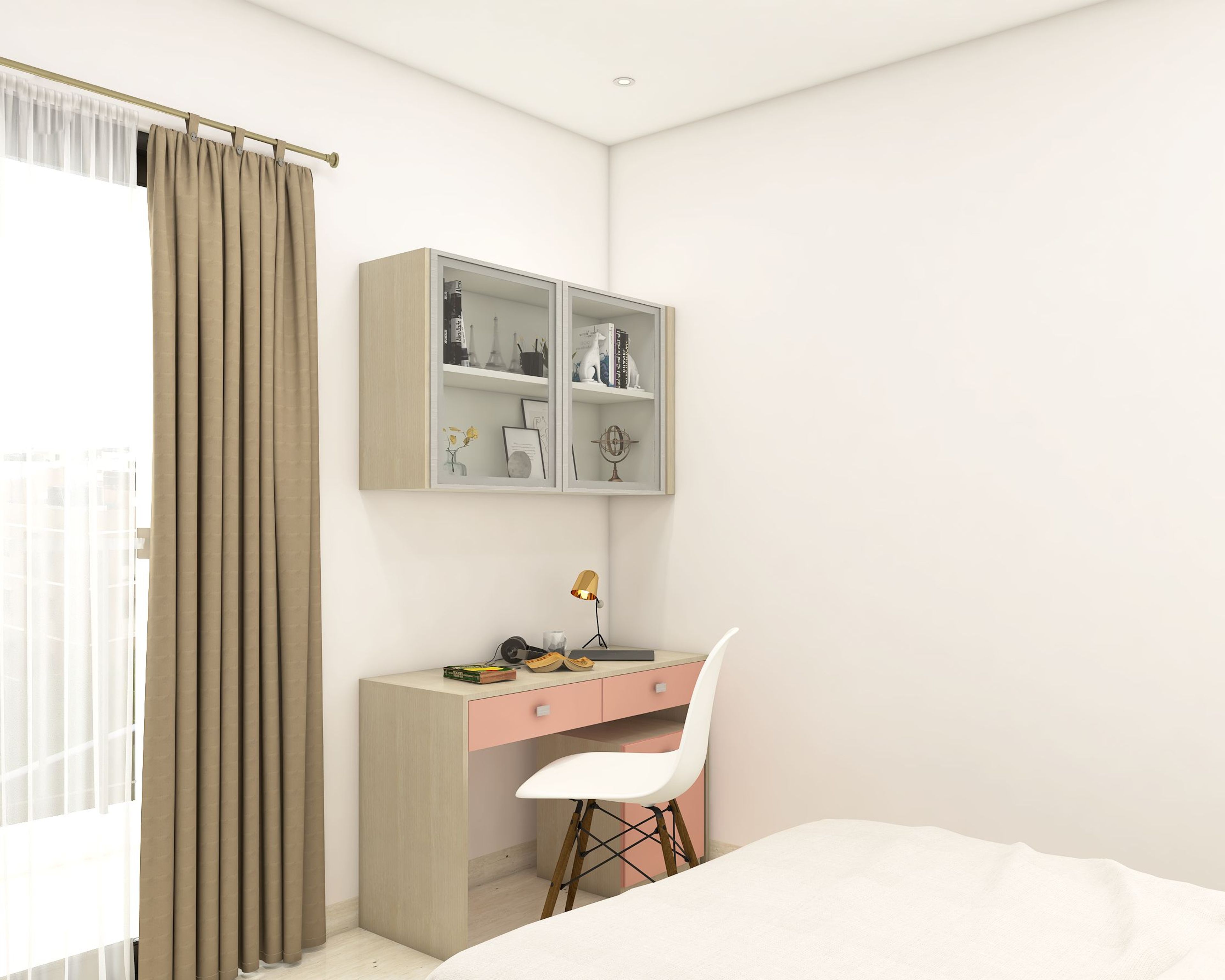 This minimalistic master bedroom design is compact and takes a minimal approach towards the materials and finishes. White and beige tones are used to keep an earthy and comforting vibe to the space. Brass details are added on the pendant lamps to add a touch of elegance. Natural wooden finishes on the door and the frames add an earthy feel, making it a perfect choice for your home.
