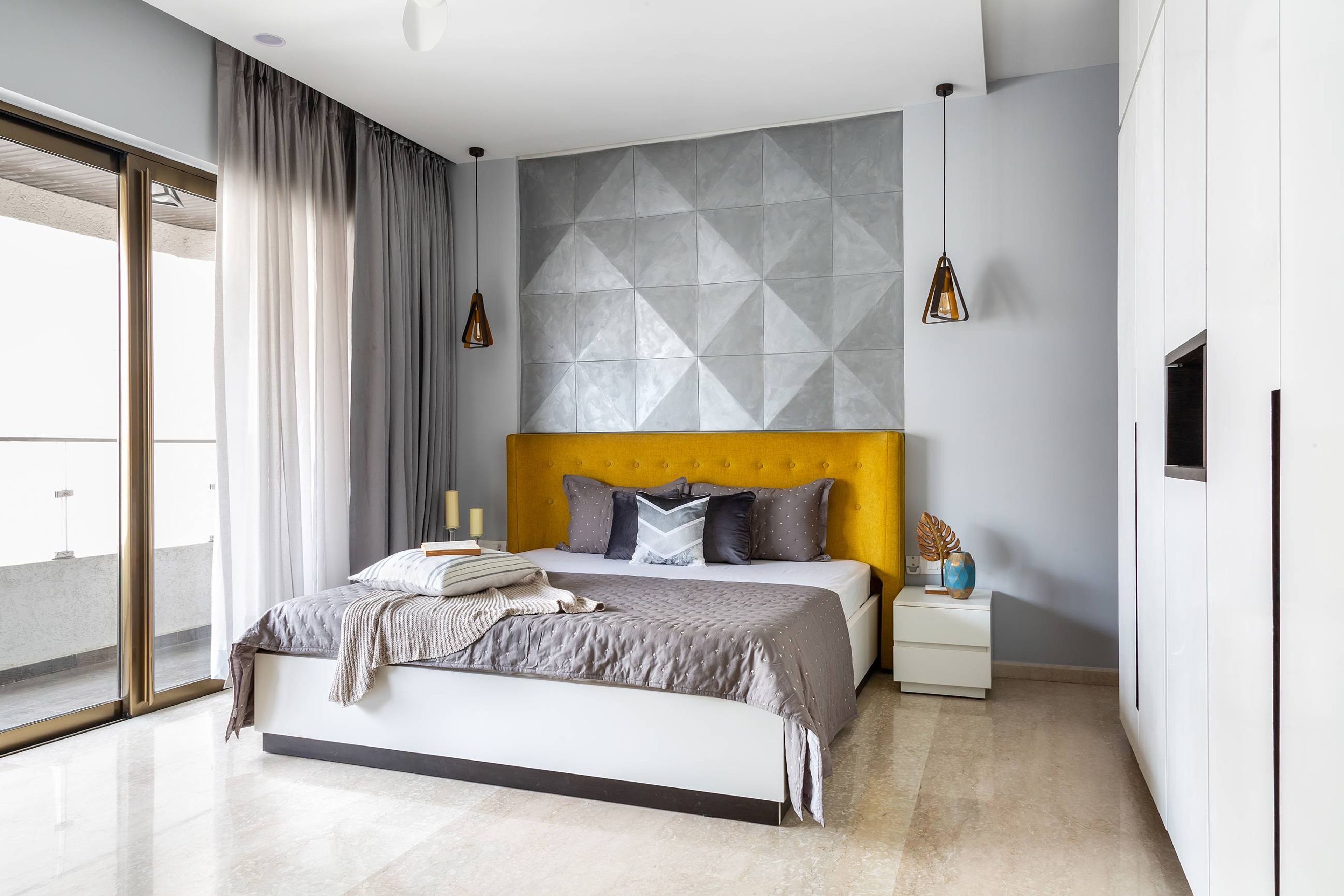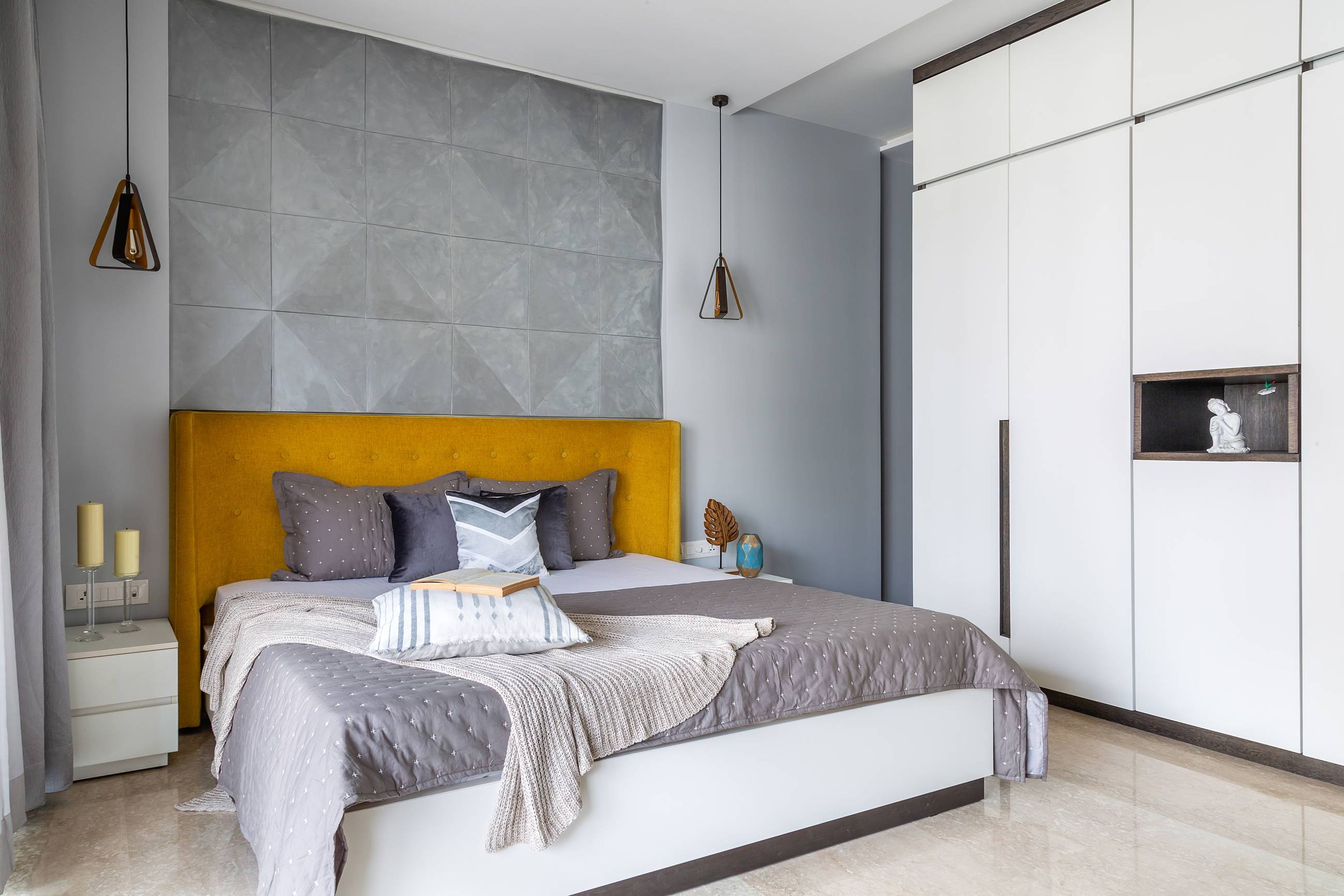 • Furniture Highlights: White double bed with a yellow tufted headboard