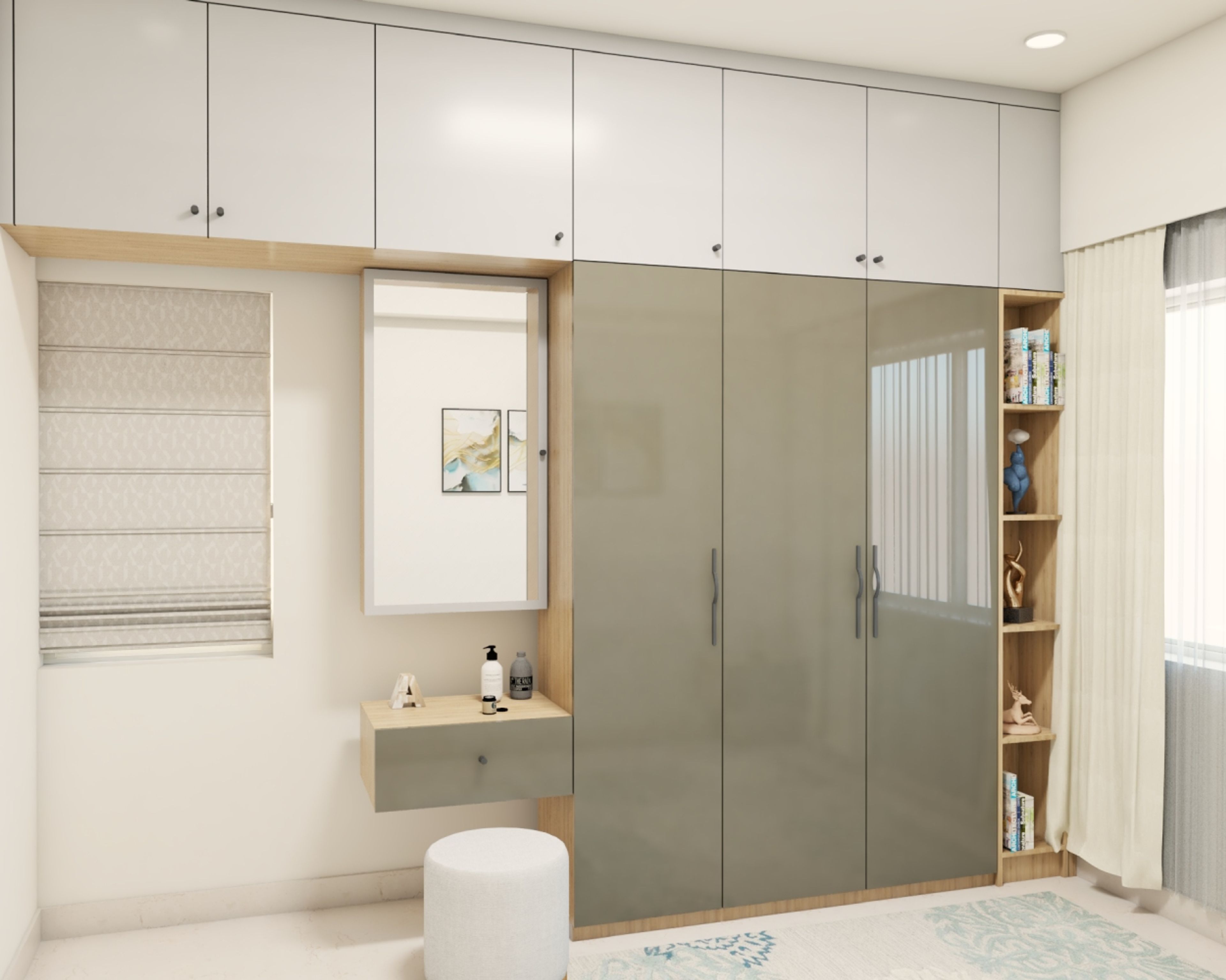 - 3-door brown swing wardrobe design with white lofts and dressing unit