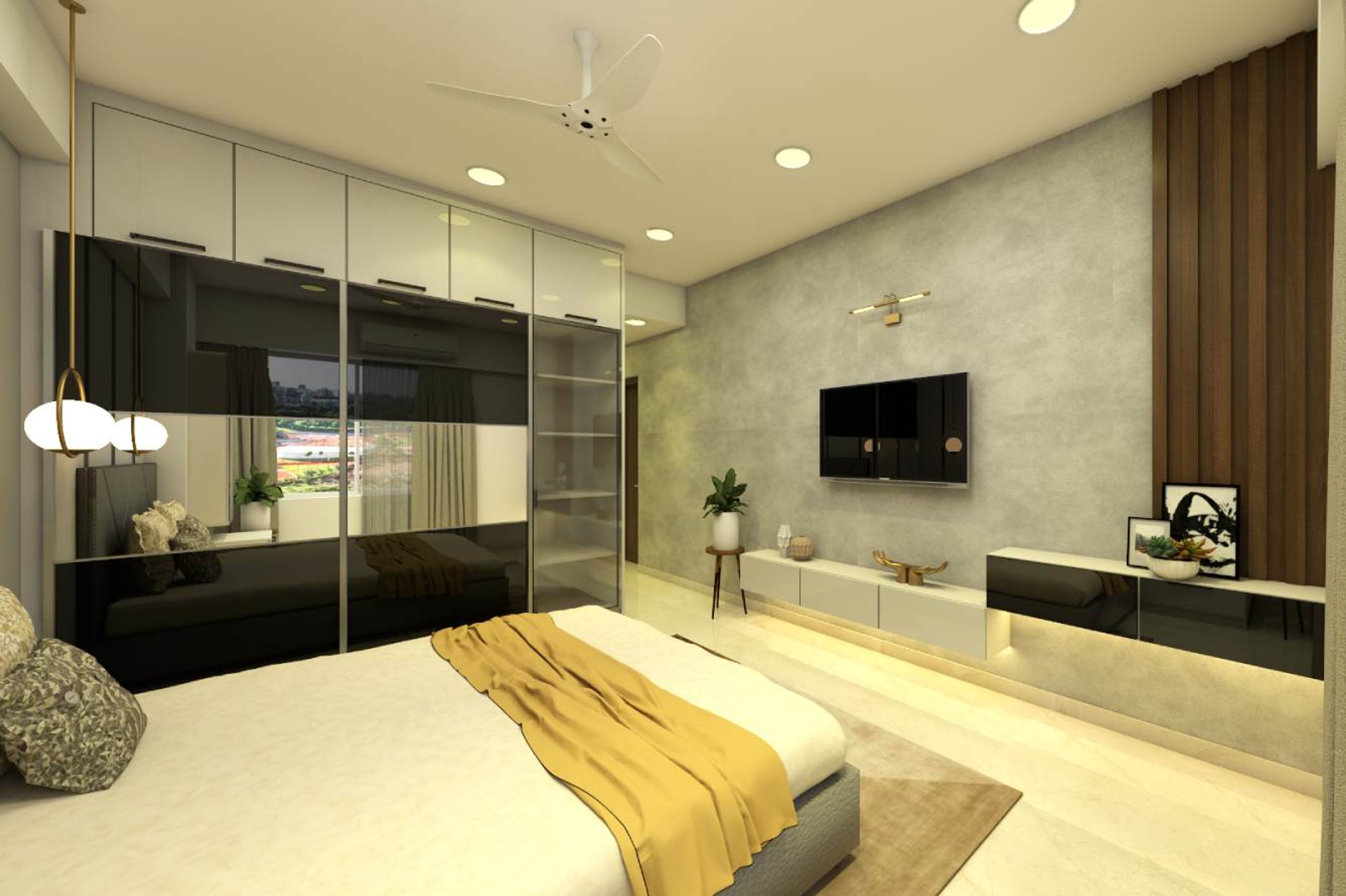 Featuring a classy glow owing to the smart lighting, this master bedroom design is a good choice for your home. The glossy-finished sliding-door wardrobe adds to the look of the room while offering storage in the form of shelves and a loft section. This bedroom design is multifunctional with a media wall and dresser unit.