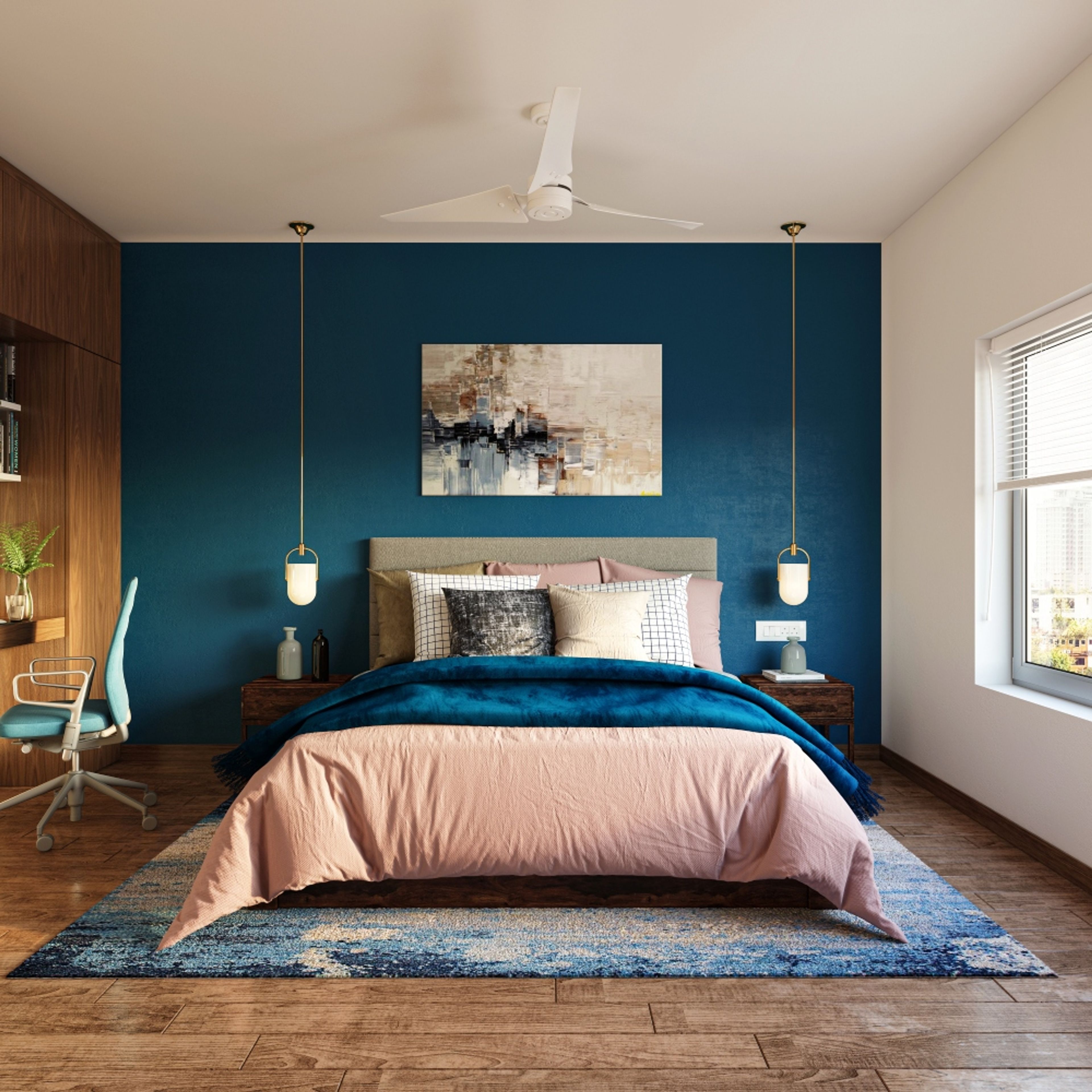 - The blue accent wall contrasts the blue and pink upholstery of the bed and the wooden accents in the room, beautifully