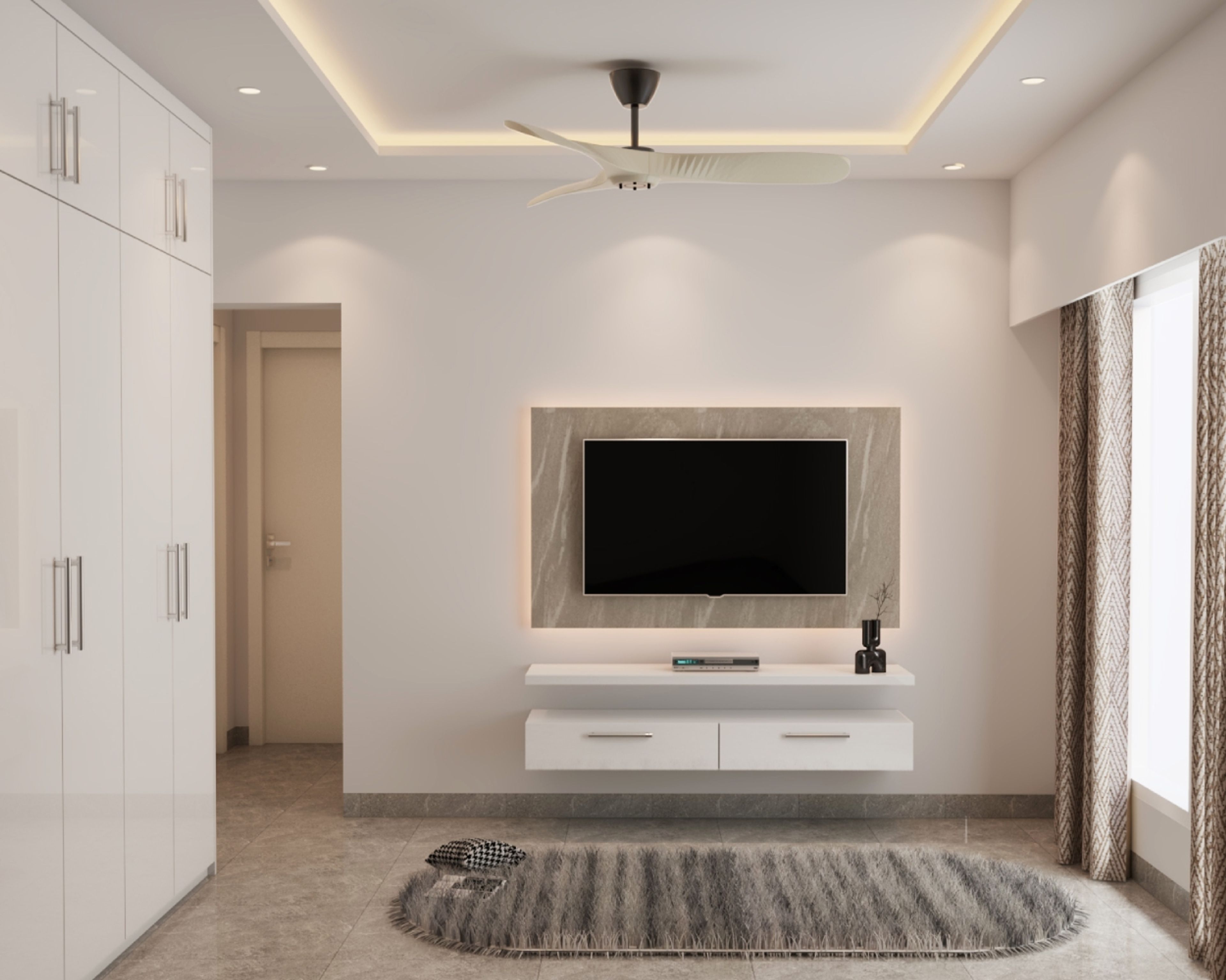 Storage Features: The room includes a wardrobe, side table, and TV unit, offering ample space for clothes, essentials, and entertainment devices while maintaining a clean and organized look.