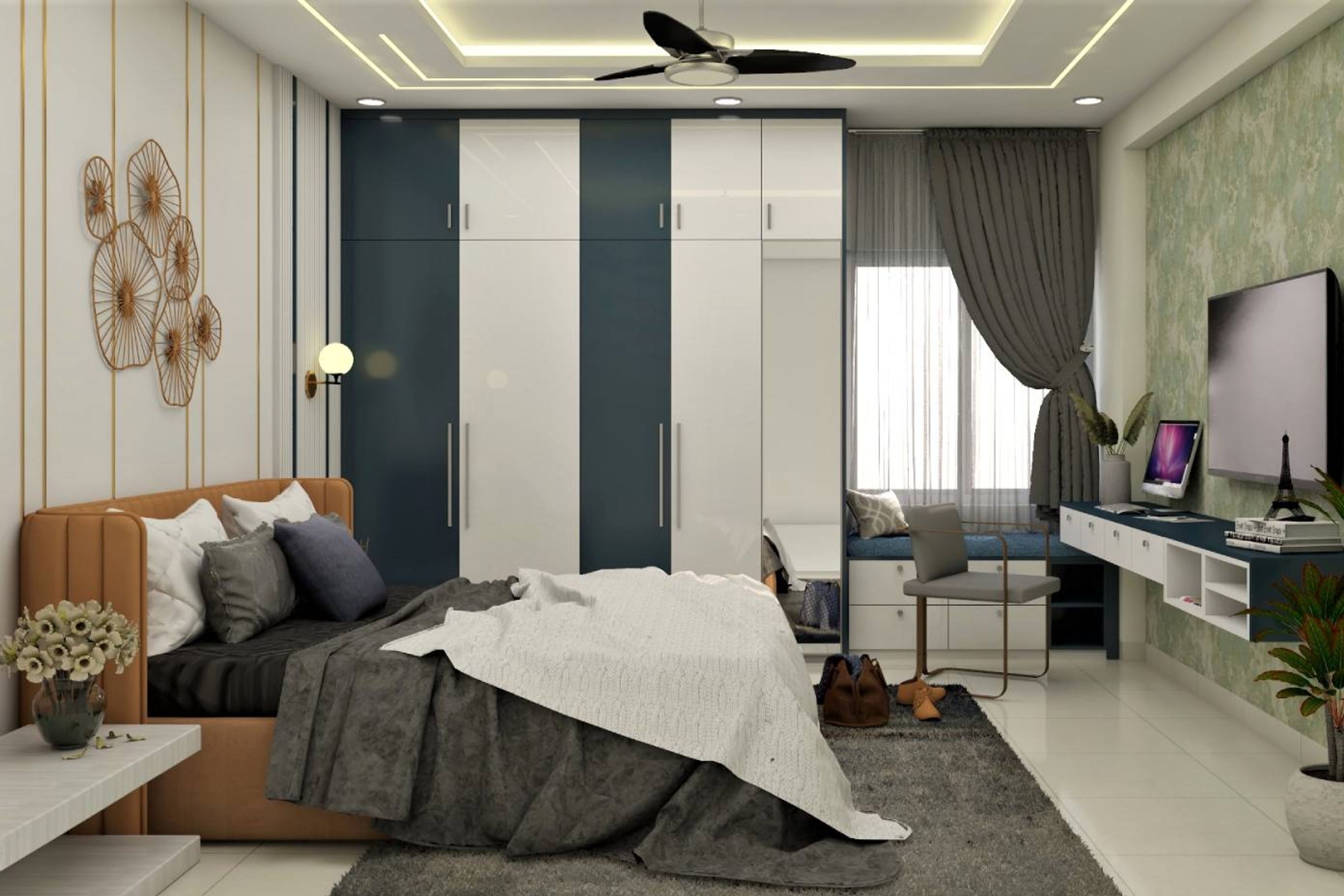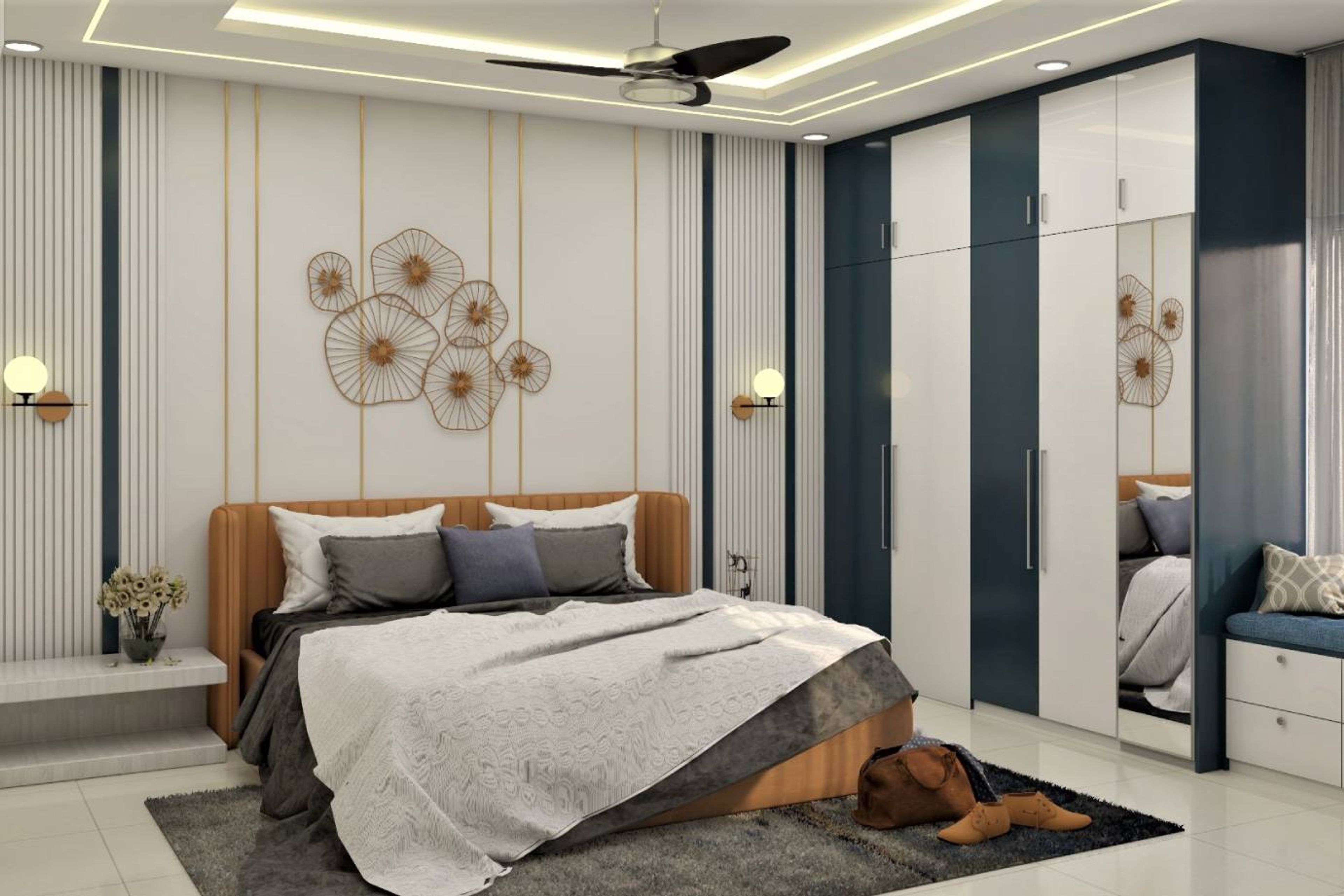 Keep your master bedroom comfortable while upgrading it in appeal with this design that is modern. The headboard is curved and has a natural finish that complements the accent wall and art installation in this room. Adding to the luxury appeal, the bedroom has a false ceiling with integrated lighting.