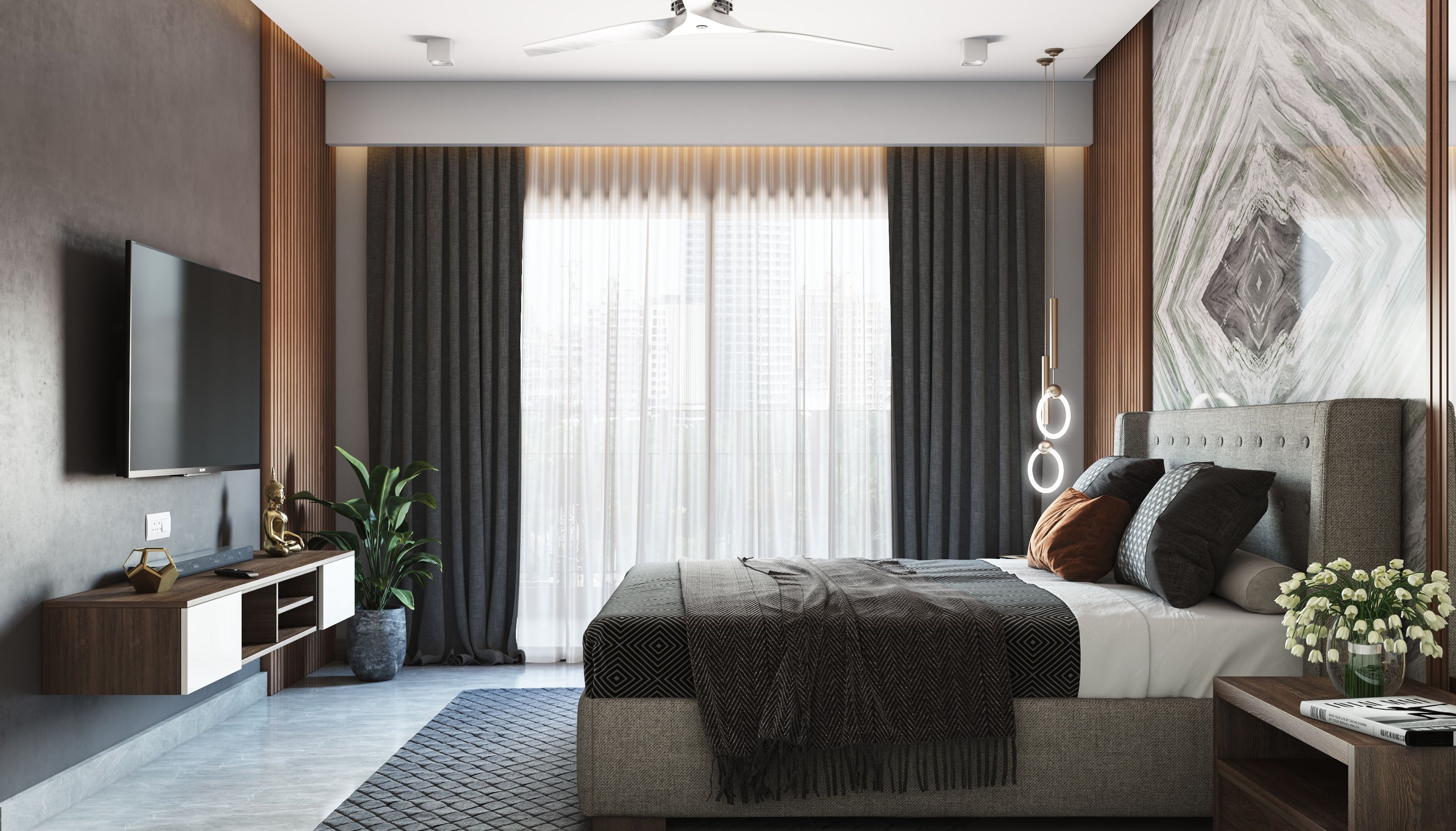 Room Highlights: The elegant marble wall panel gives the master bedroom a regal aesthetic