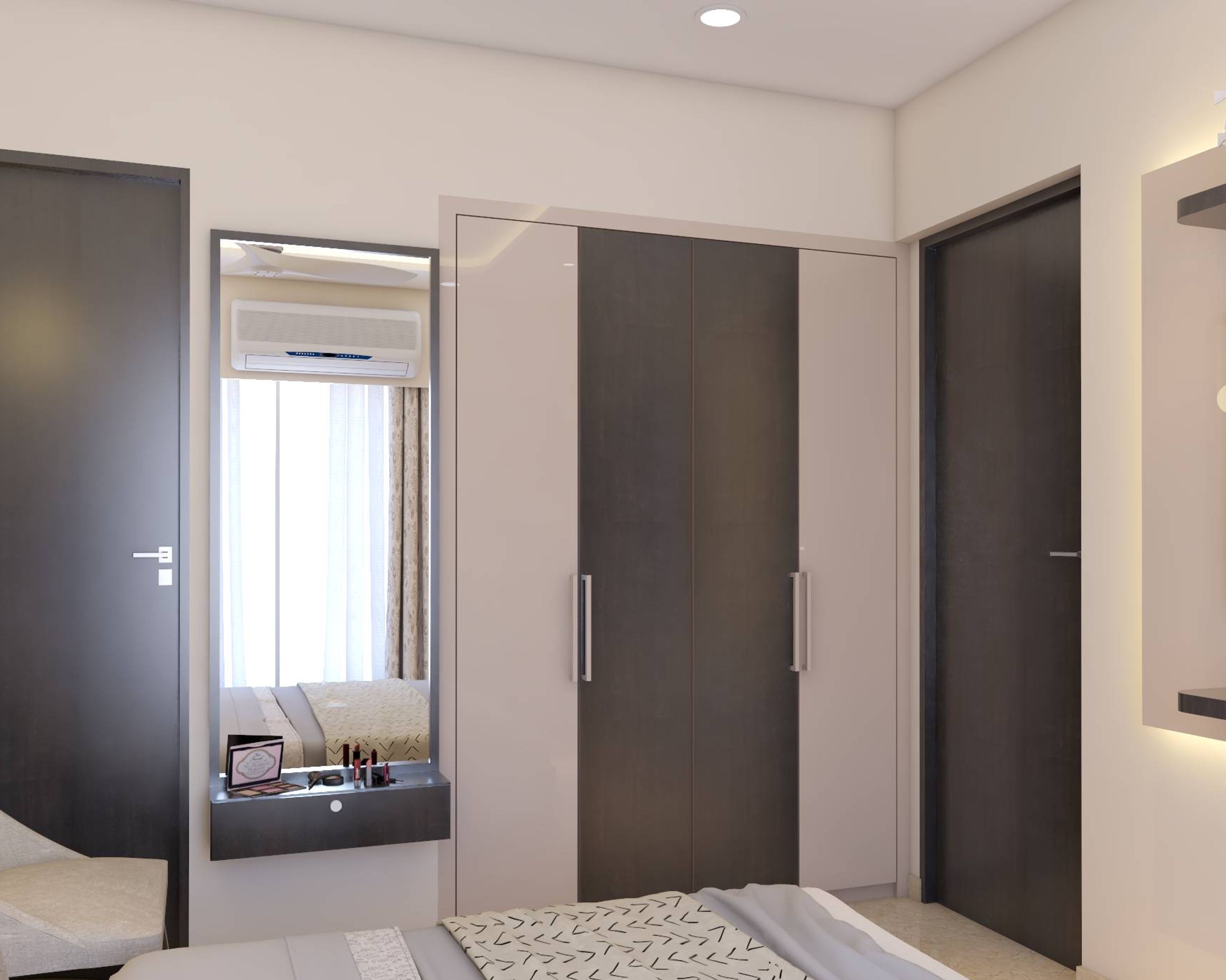 Elegance abounds in this master bedroom design with the white floral wallpaper giving a refined look. The dressing unit with the dark wood grain pullout drawers looks cosy and comfortable, while the full-length mirror reflects the space and makes it look bigger. The soft beige fabric headboard also adds to the cosy look of this bedroom