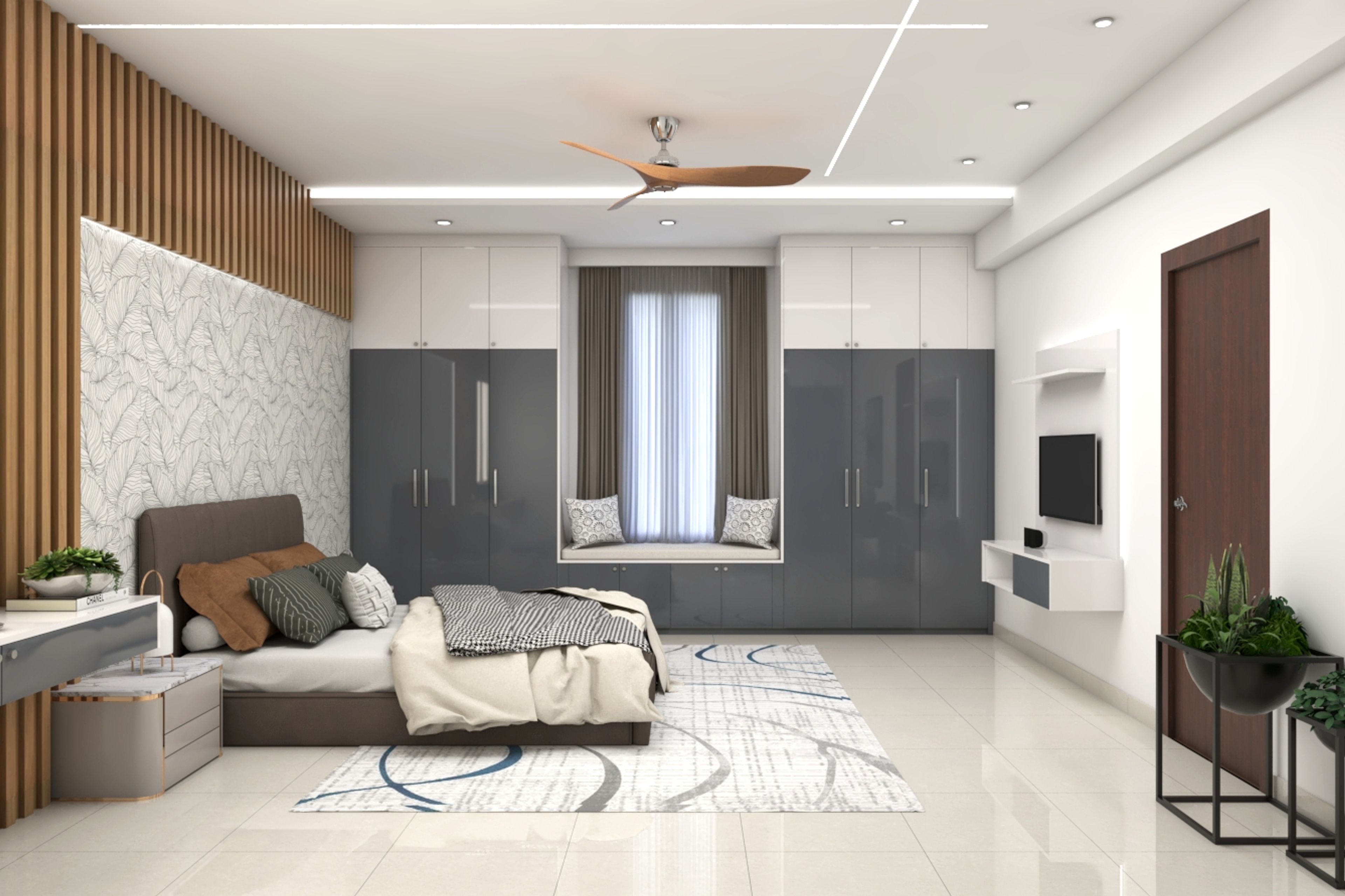 This master bedroom design is the epitome of luxury and comfort. The bed's back wall is treated with fluted wooden panels and black and white floral wallpaper, giving the room a stylish and elegant feel. The wall-mounted pullout drawers with a glossy grey finish and white carcass creates an elegant look. The glossy white and grey wardrobe shutters with chrome handles and window seating also provide a comfortable place to sit and enjoy a view of the outside world.
