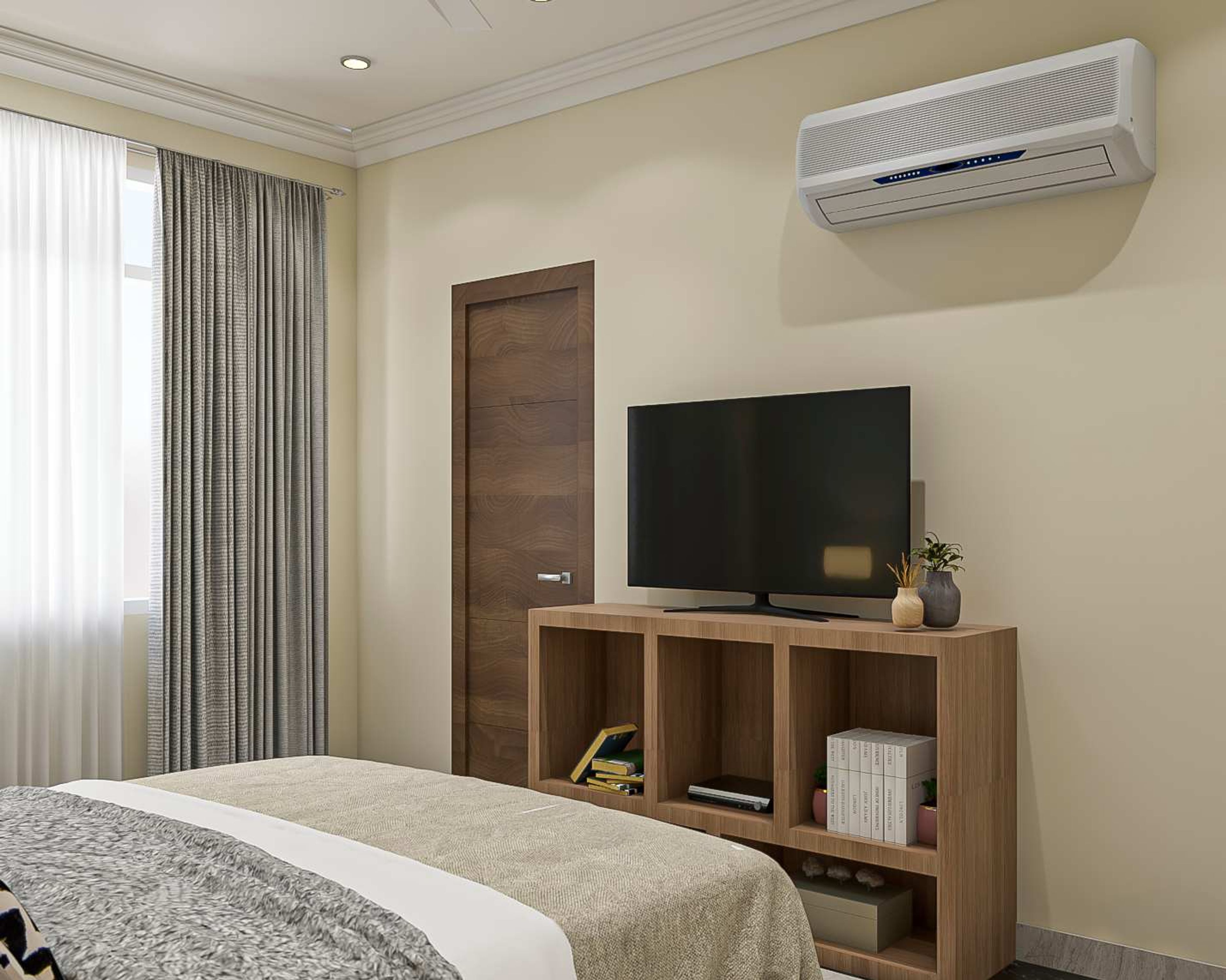 This spacious bedroom is packed with features that will help you relax and unwind. The pastel colour tones give a light and airy feel, while the double bed in wooden material looks timeless and classy. The pastel green accent wall with the abstract modern painting also acts as the focus and gives a bold look. A simple TV console unit with storage space completes the look.