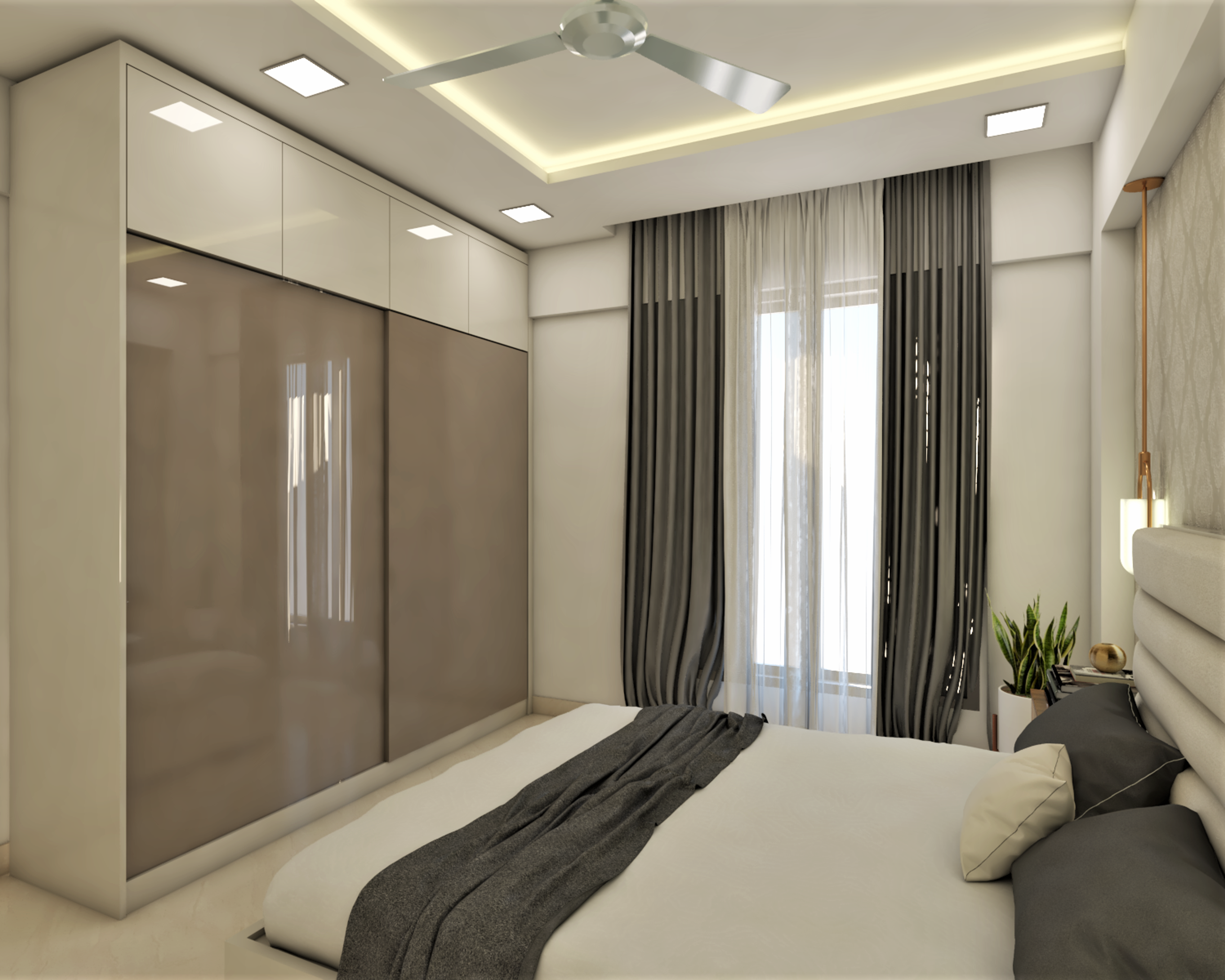 A modern, spacious master bedroom design. The creamy white finished bed with a tufted headboard and charcoal grey bedding with pillows looks good. The pale grey-patterned wallpaper on the headboard wall complements the white wall. The wall-mounted dressing mirror has inbuilt storage. A grey wardrobe with a creamy white loft of glossy-finished sliding doors is perfect to save space.