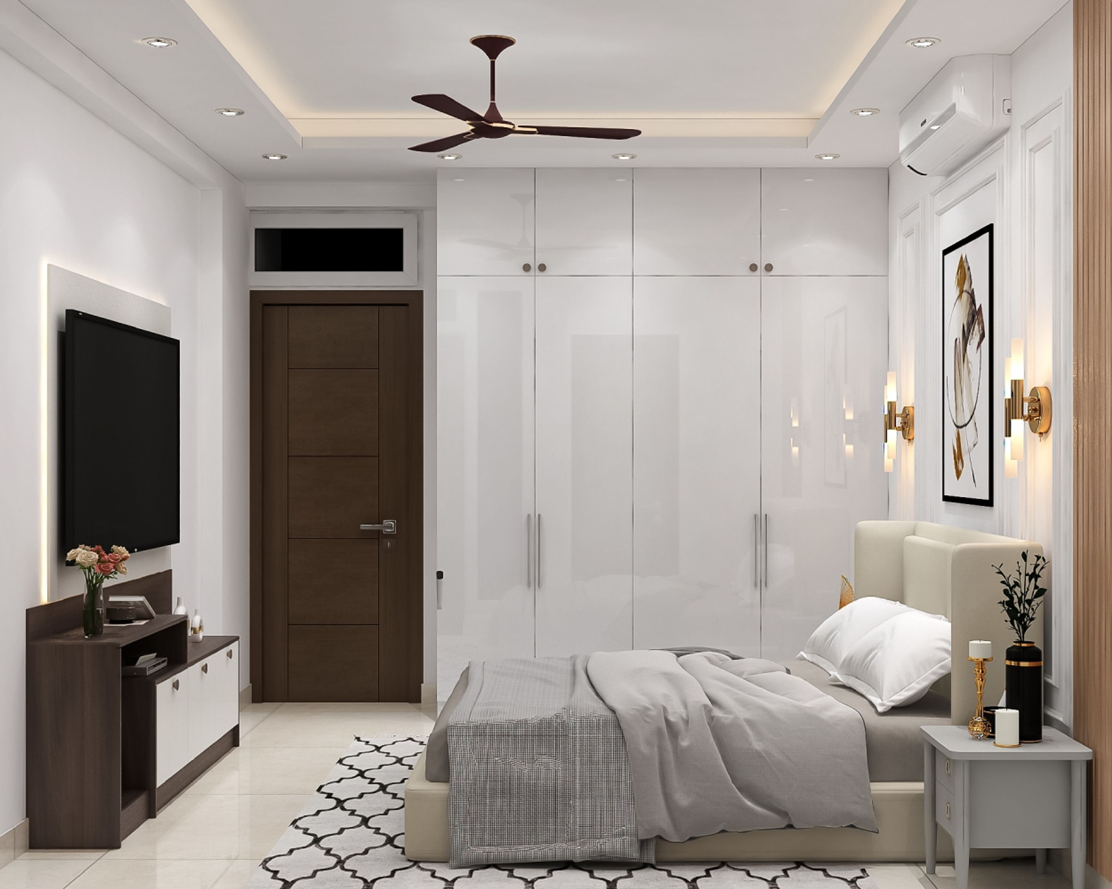 Storage Features: This bedroom includes ample storage with a spacious wardrobe and dual side tables, blending utility with aesthetic appeal.