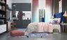 A mix of  pastel hues and dark accents, and an eclectic mix of industrial and modern furnishings binds this bedroom in an aura of absolute coziness.   The spacious and comfortable Zoe bed is set  against an exposed brick wall. The compact Hadley side table and Espeneli sideboard stylishly fit in to serve the purpose of storage, while the Monroe sofa pampers you as you  lounge in it for hours.